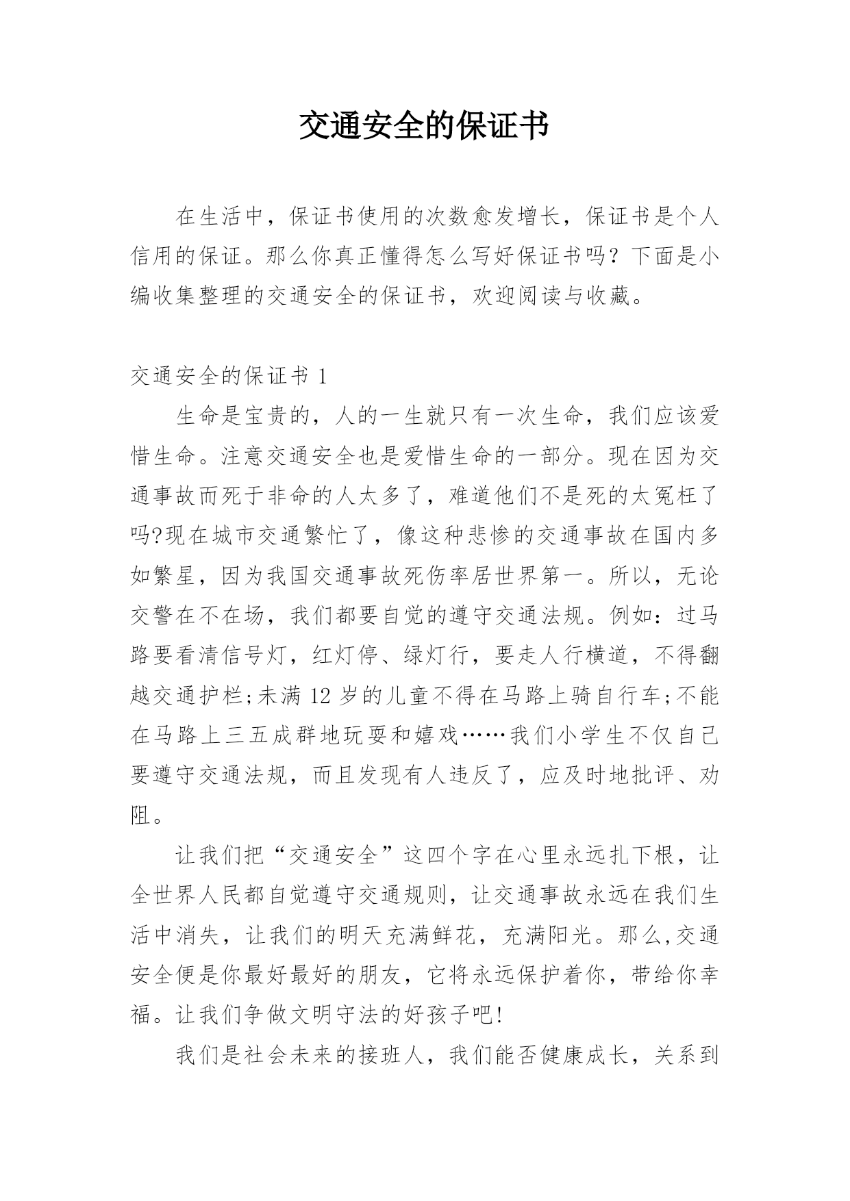 交通安全的保证书在生活中,保证书使用的次数愈发增长,保证书是个人信用的保证。那么你真正懂得怎么写好保证书吗?下面是小编收集整理的交通安全的保证书,欢迎阅读与收藏。交通安全的保证书1生命是宝贵的,人的一生就只有一次生命,我们应该爱惜生命。注意交通安全也是爱惜生命的一部分。现在因为交通事故而死于非命的人太多了,难道他们不是死的太冤枉了吗?现在城市交通繁忙了,像这种悲惨的交通事故在国内多如繁星,因为我国交通事故死伤率居世界第一。所以,无论交警在不在场,我们都要自觉的遵守交通法规。例如:过马路要看清信号灯,红灯停