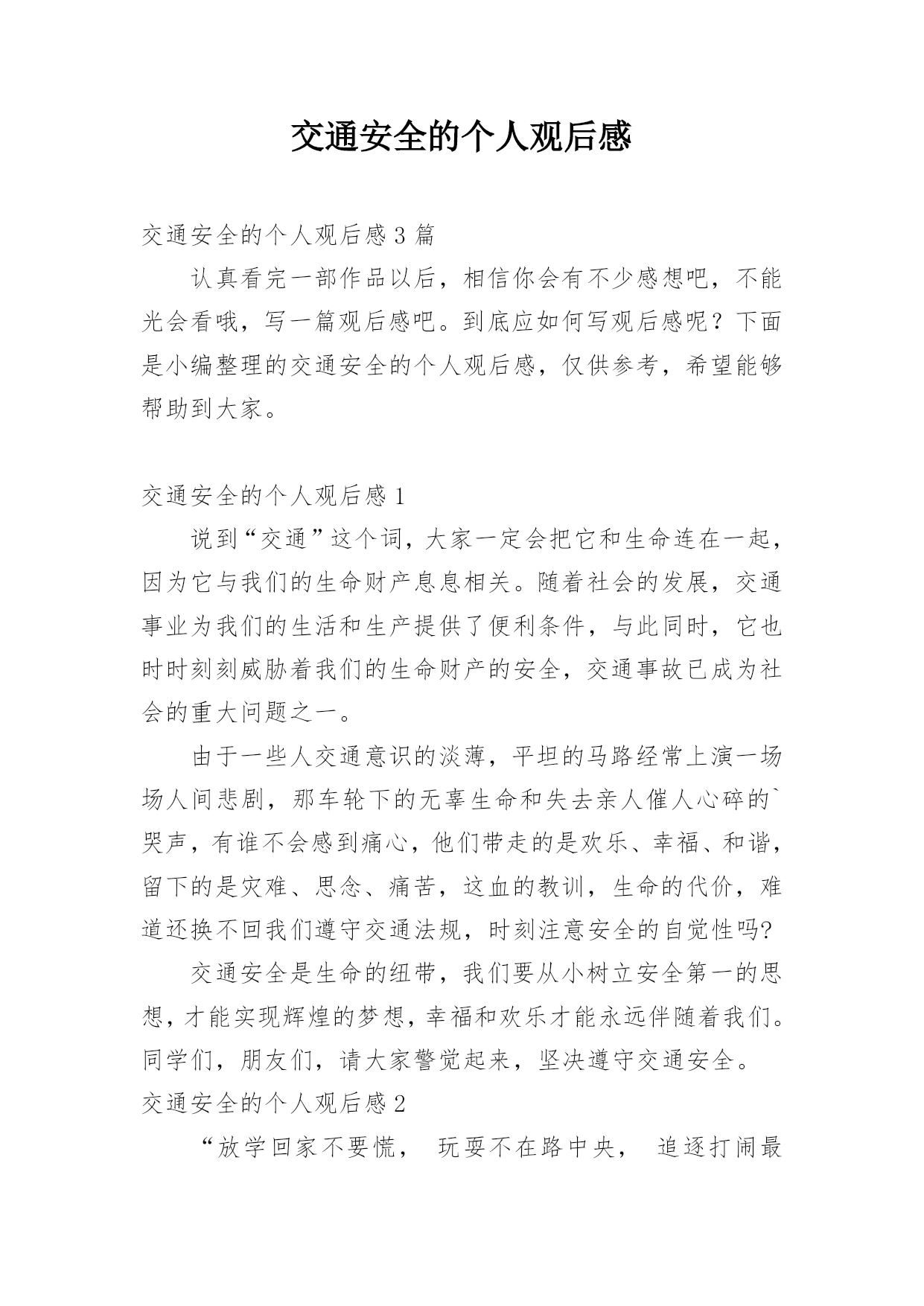 交通安全的个人观后感交通安全的个人观后感3篇认真看完一部作品以后,相信你会有不少感想吧,不能光会看哦,写一篇观后感吧。到底应如何写观后感呢?下面是小编整理的交通安全的个人观后感,仅供参考,希望能够帮助到大家。交通安全的个人观后感1说到“交通”这个词,大家一定会把它和生命连在一起,因为它与我们的生命财产息息相关。随着社会的发展,交通事业为我们的生活和生产提供了便利条件,与此同时,它也时时刻刻威胁着我们的生命财产的安全,交通事故已成为社会的重大问题之一。由于一些人交通意识的淡薄,平坦的马路经常上演一场场人间悲