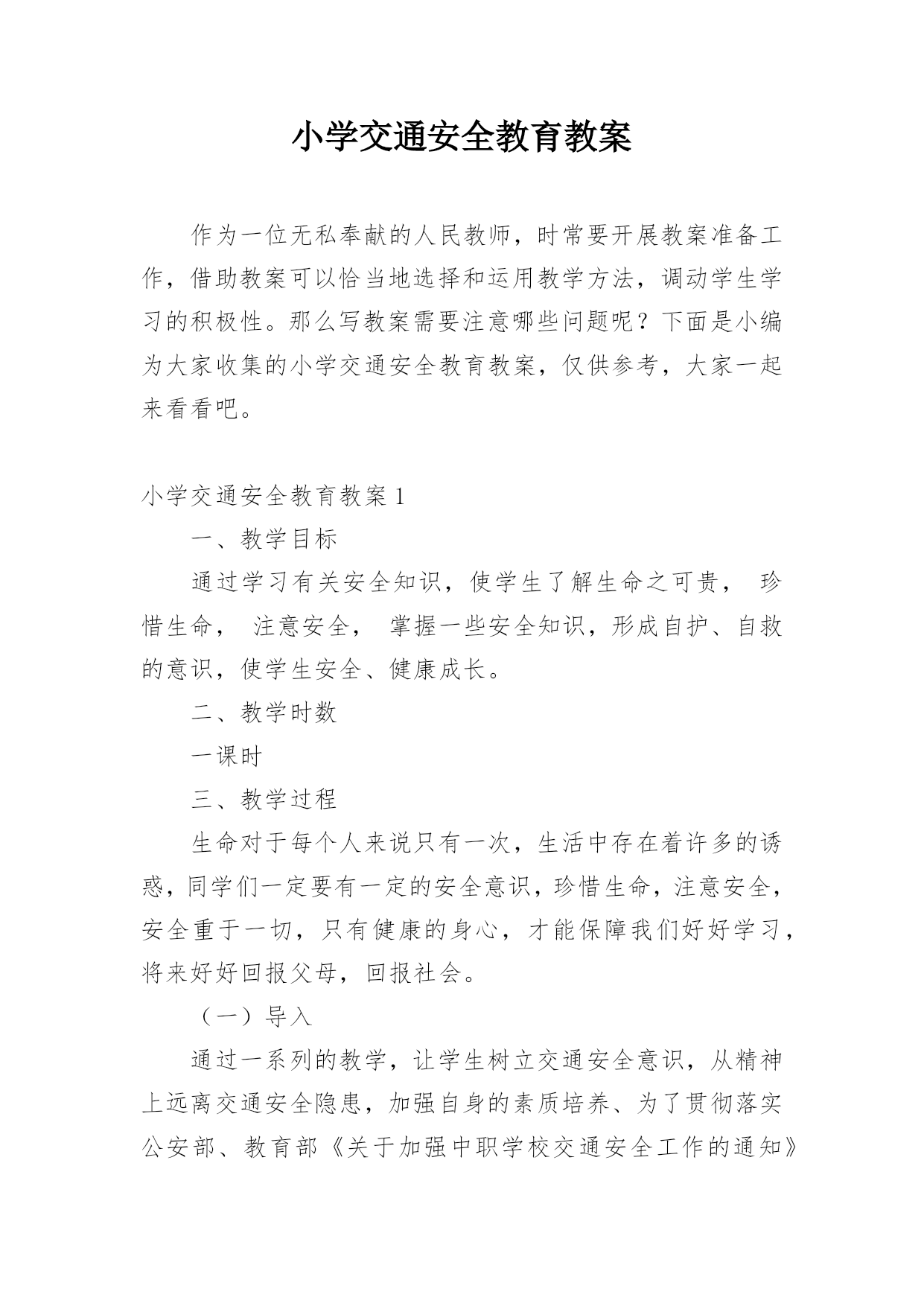 小学交通安全教育教案作为一位无私奉献的人民教师,时常要开展教案准备工作,借助教案可以恰当地选择和运用教学方法,调动学生学习的积极性。那么写教案需要注意哪些问题呢?下面是小编为大家收集的小学交通安全教育教案,仅供参考,大家一起来看看吧。小学交通安全教育教案1一、教学目标通过学习有关安全知识,使学生了解生命之可贵,珍惜生命,注意安全,掌握一些安全知识,形成自护、自救的意识,使学生安全、健康成长。二、教学时数一课时三、教学过程生命对于每个人来说只有一次,生活中存在着许多的诱惑,同学们一定要有一定的安全意识,珍惜