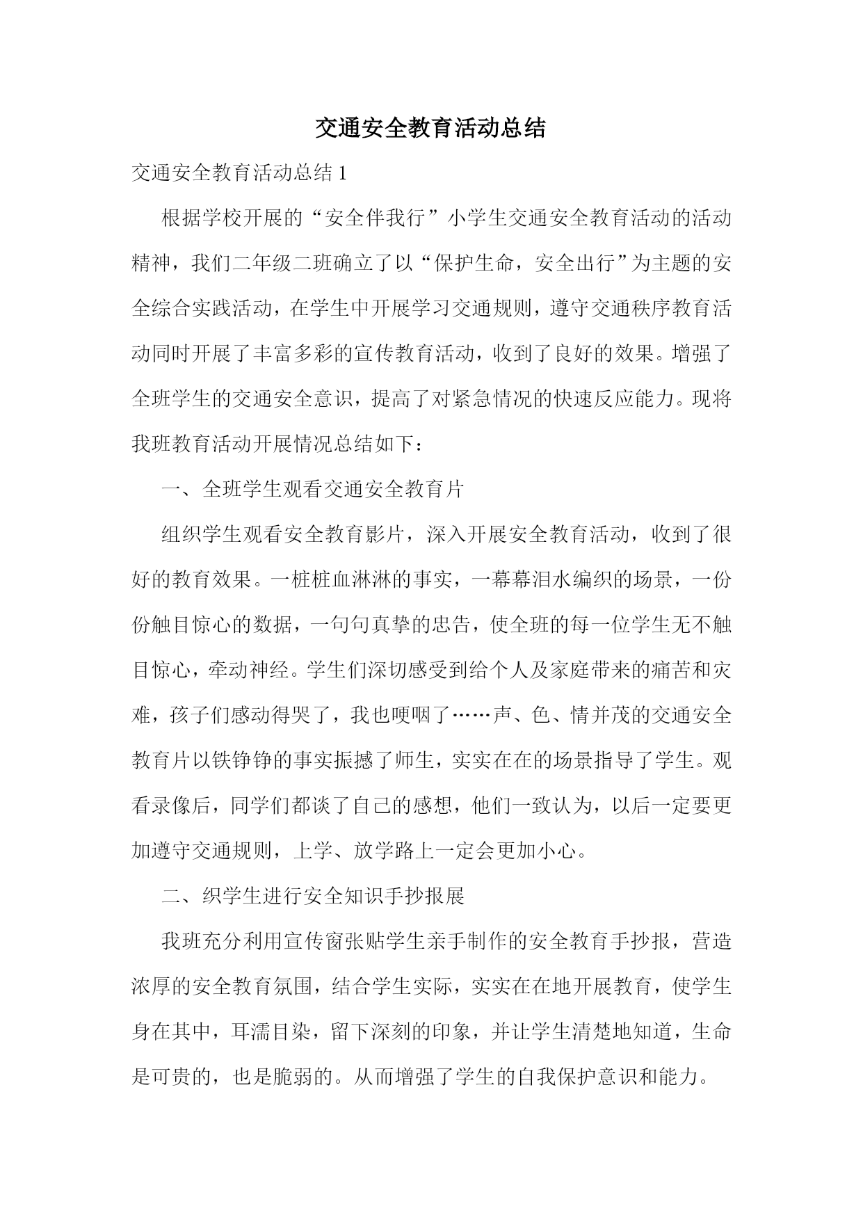交通安全教育活动总结交通安全教育活动总结1根据学校开展的“安全伴我行”小学生交通安全教育活动的活动精神,我们二年级二班确立了以“保护生命,安全出行”为主题的安全综合实践活动,在学生中开展学习交通规则,遵守交通秩序教育活动同时开展了丰富多彩的宣传教育活动,收到了良好的效果。增强了全班学生的交通安全意识,提高了对紧急情况的快速反应能力。现将我班教育活动开展情况总结如下:一、全班学生观看交通安全教育片组织学生观看安全教育影片,深入开展安全教育活动,收到了很好的教育效果。一桩桩血淋淋的事实,一幕幕泪水编织的场景,