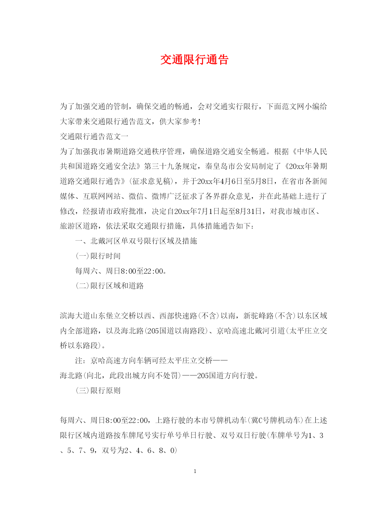 此资料由网络收集而来,如有侵权请告知上传者立即删除。资料共分享,我们负责传递知识。PAGEPAGE7交通限行通告为了加强交通的管制,确保交通的畅通,会对交通实行限行,下面范文网小编给大家带来交通限行通告范文,供大家参考!交通限行通告范文一为了加强我市暑期道路交通秩序管理,确保道路交通安全畅通。根据《中华人民共和国道路交通安全法》第三十九条规定,秦皇岛市公安局制定了《20xx年暑期道路交通限行通告》(征求意见稿),并于20xx年4月6日至5月8日,在省市各新闻媒体、互联网网站、微信、微博广泛征求