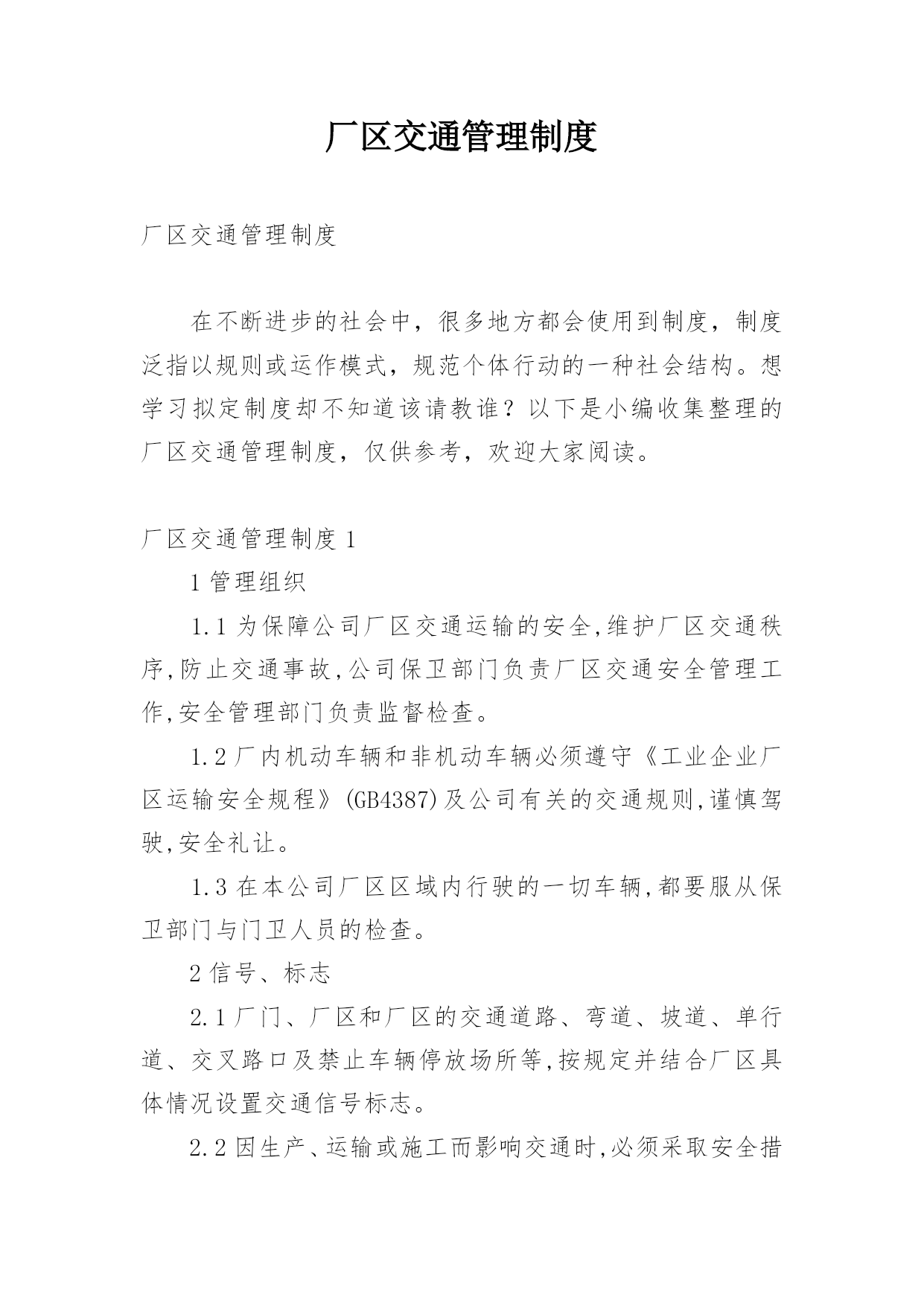 厂区交通管理制度厂区交通管理制度在不断进步的社会中,很多地方都会使用到制度,制度泛指以规则或运作模式,规范个体行动的一种社会结构。想学习拟定制度却不知道该请教谁?以下是小编收集整理的厂区交通管理制度,仅供参考,欢迎大家阅读。厂区交通管理制度11管理组织1.1为保障公司厂区交通运输的安全,维护厂区交通秩序,防止交通事故,公司保卫部门负责厂区交通安全管理工作,安全管理部门负责监督检查。1.2厂内机动车辆和非机动车辆必须遵守《工业企业厂区运输安全规程》(GB4387)及公司有关的交通规则,谨慎驾驶,安全礼让。1