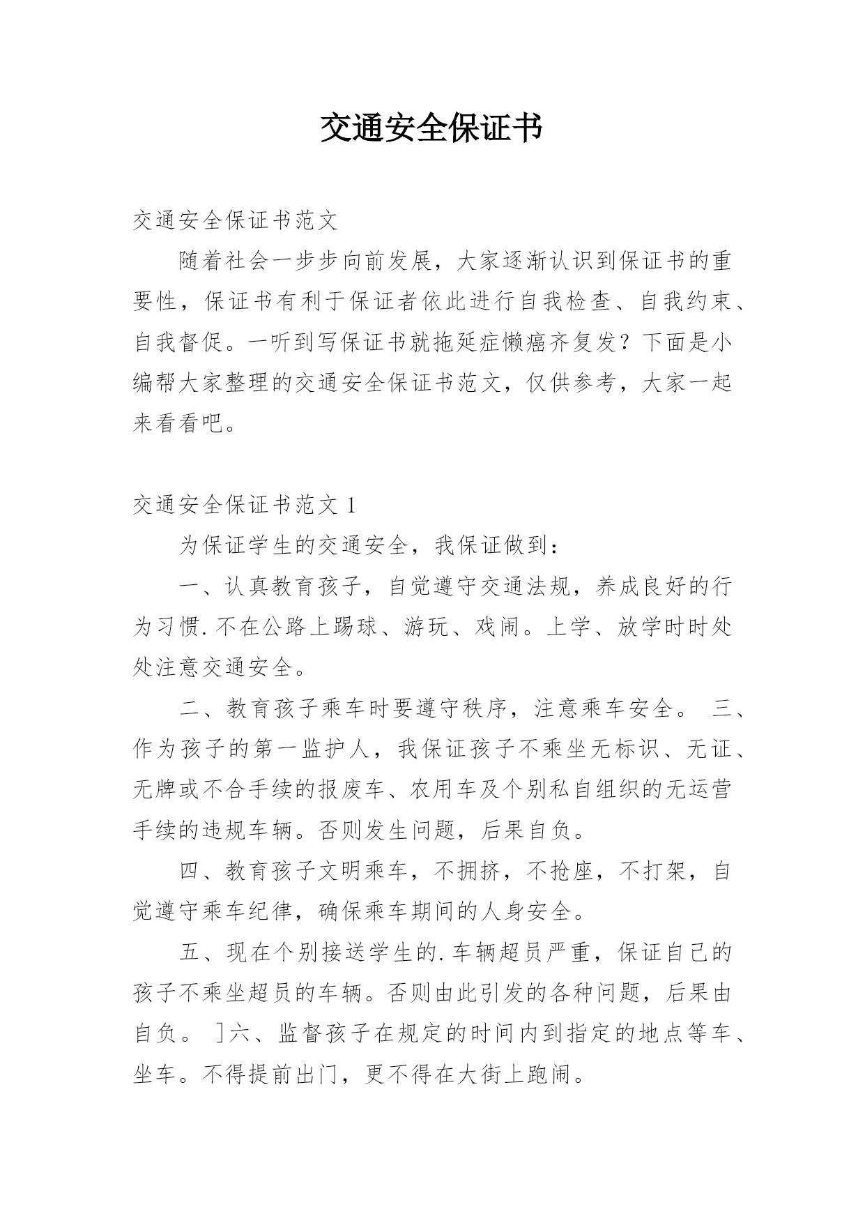 交通安全保证书交通安全保证书范文随着社会一步步向前发展,大家逐渐认识到保证书的重要性,保证书有利于保证者依此进行自我检查、自我约束、自我督促。一听到写保证书就拖延症懒癌齐复发?下面是小编帮大家整理的交通安全保证书范文,仅供参考,大家一起来看看吧。交通安全保证书范文1为保证学生的交通安全,我保证做到:一、认真教育孩子,自觉遵守交通法规,养成良好的行为习惯.不在公路上踢球、游玩、戏闹。上学、放学时时处处注意交通安全。二、教育孩子乘车时要遵守秩序,注意乘车安全。三、作为孩子的第一监护人,我保证孩子不乘坐无标识、