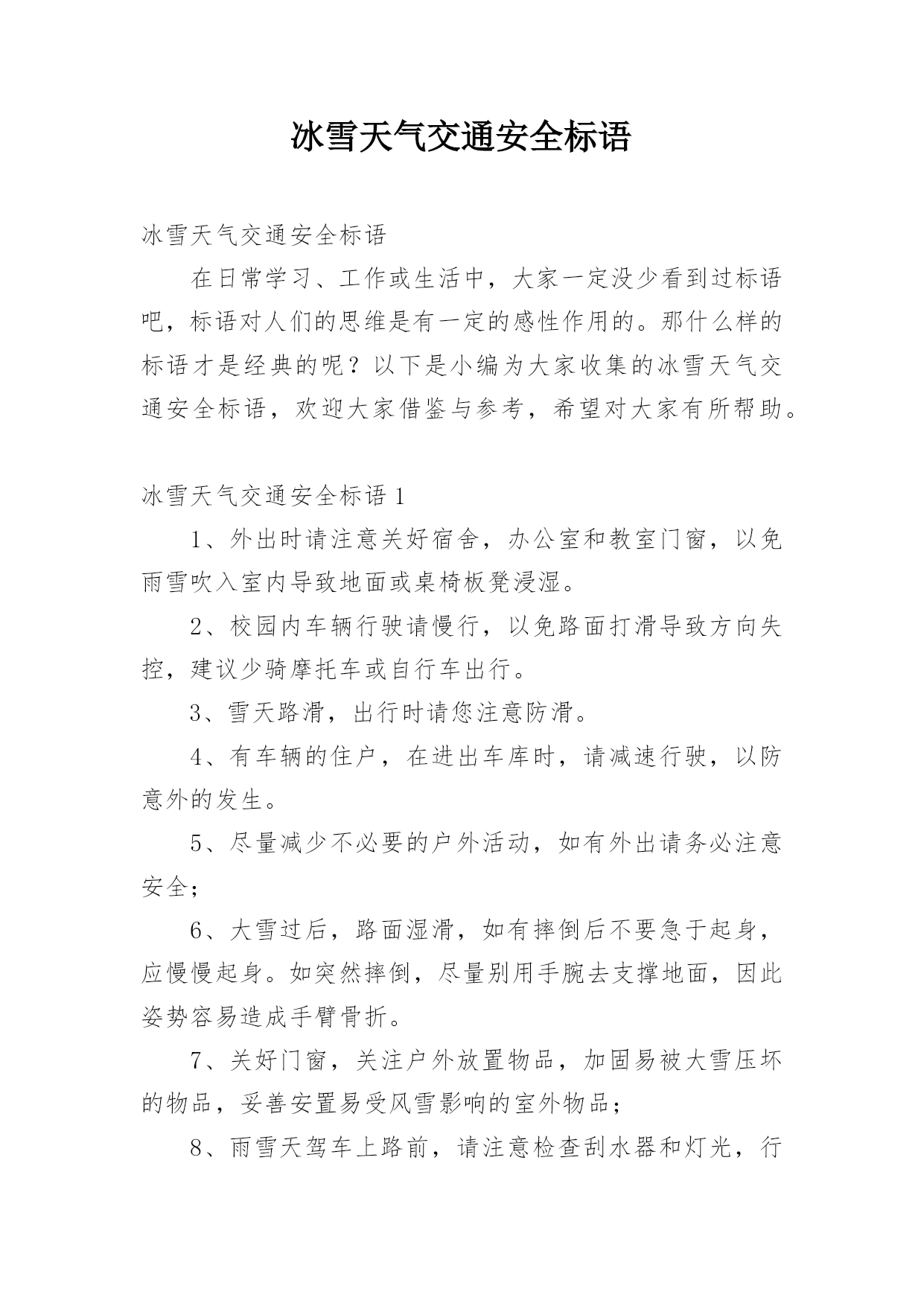 冰雪天气交通安全标语冰雪天气交通安全标语在日常学习、工作或生活中,大家一定没少看到过标语吧,标语对人们的思维是有一定的感性作用的。那什么样的标语才是经典的呢?以下是小编为大家收集的冰雪天气交通安全标语,欢迎大家借鉴与参考,希望对大家有所帮助。冰雪天气交通安全标语11、外出时请注意关好宿舍,办公室和教室门窗,以免雨雪吹入室内导致地面或桌椅板凳浸湿。2、校园内车辆行驶请慢行,以免路面打滑导致方向失控,建议少骑摩托车或自行车出行。3、雪天路滑,出行时请您注意防滑。4、有车辆的住户,在进出车库时,请减速行驶,以防