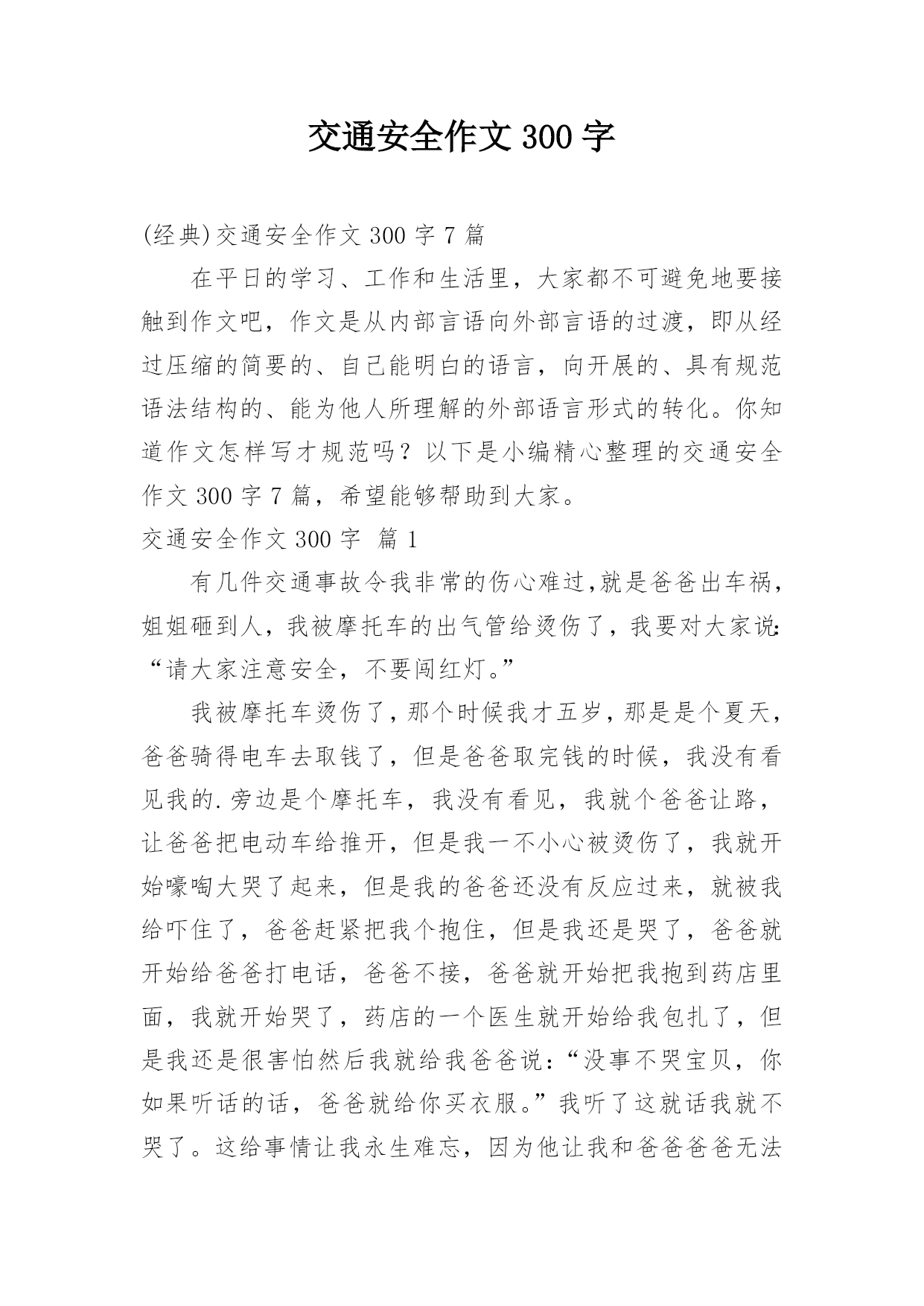交通安全作文300字(经典)交通安全作文300字7篇在平日的学习、工作和生活里,大家都不可避免地要接触到作文吧,作文是从内部言语向外部言语的过渡,即从经过压缩的简要的、自己能明白的语言,向开展的、具有规范语法结构的、能为他人所理解的外部语言形式的转化。你知道作文怎样写才规范吗?以下是小编精心整理的交通安全作文300字7篇,希望能够帮助到大家。交通安全作文300字篇1有几件交通事故令我非常的伤心难过,就是爸爸出车祸,姐姐砸到人,我被摩托车的出气管给烫伤了,我要对大家说:“请大家注意安全,不要闯红灯。”我被摩