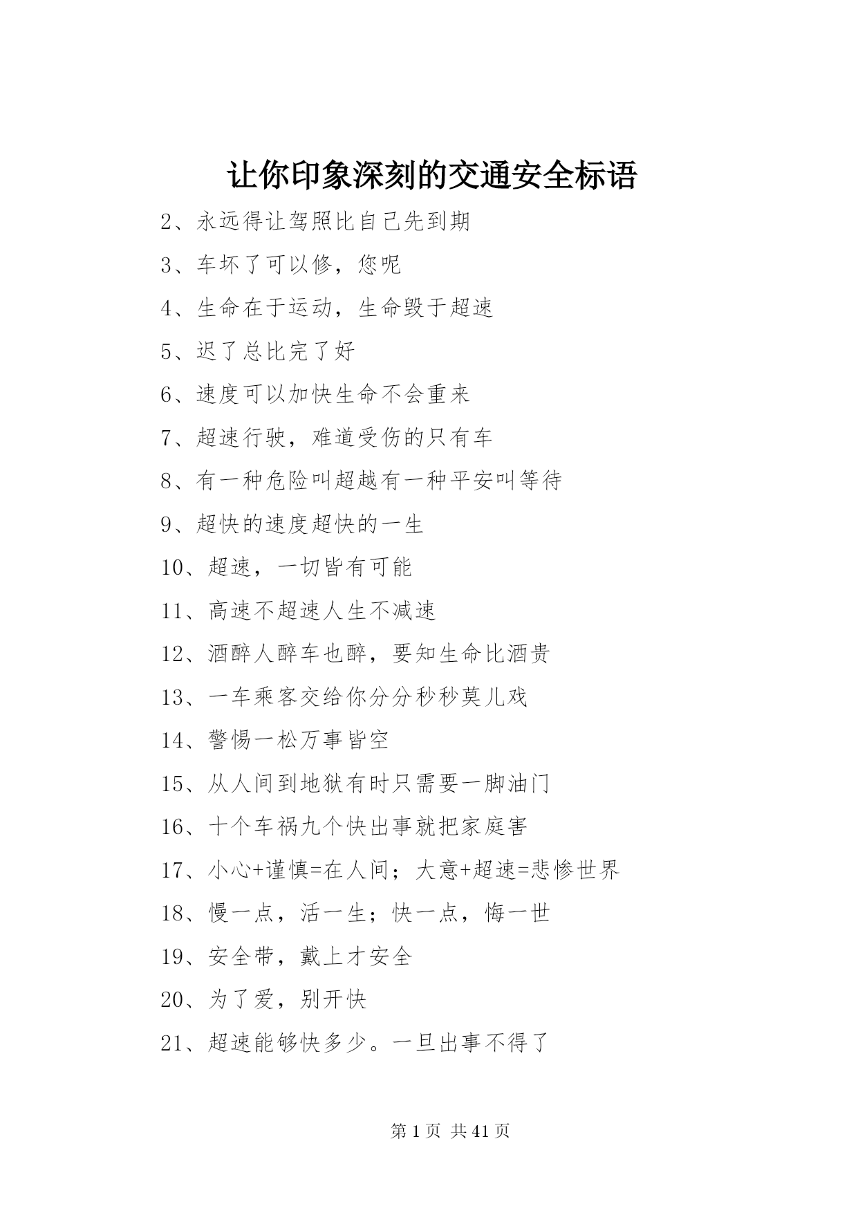 第PAGE\*Arabic\*MERGEFORMAT41页共NUMPAGES\*MERGEFORMAT41页让你印象深刻的交通安全标语2、永远得让驾照比自己先到期3、车坏了可以修,您呢4、生命在于运动,生命毁于超速5、迟了总比完了好6、速度可以加快生命不会重来7、超速行驶,难道受伤的只有车8、有一种危险叫超越有一种平安叫等待9、超快的速度超快的一生10、超速,一切皆有可能11、高速不超速人生不减速12、酒醉人醉车也醉,要知生命比酒贵13、一车乘客交给你分分秒秒莫儿戏14、警惕一松万事皆空15、