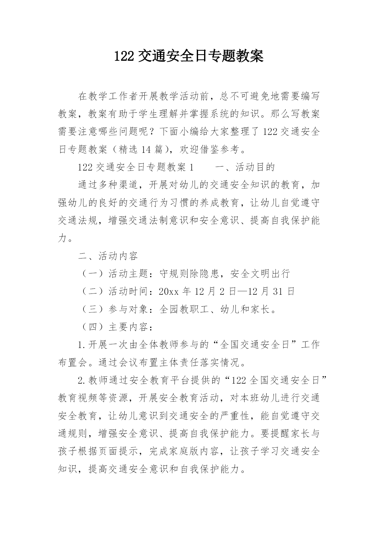 122交通安全日专题教案在教学工作者开展教学活动前,总不可避免地需要编写教案,教案有助于学生理解并掌握系统的知识。那么写教案需要注意哪些问题呢?下面小编给大家整理了122交通安全日专题教案(精选14篇),欢迎借鉴参考。122交通安全日专题教案1一、活动目的通过多种渠道,开展对幼儿的交通安全知识的教育,加强幼儿的良好的交通行为习惯的养成教育,让幼儿自觉遵守交通法规,增强交通法制意识和安全意识、提高自我保护能力。二、活动内容(一)活动主题:守规则除隐患,安全文明出行(二)活动时间:20xx年12月2日—12月
