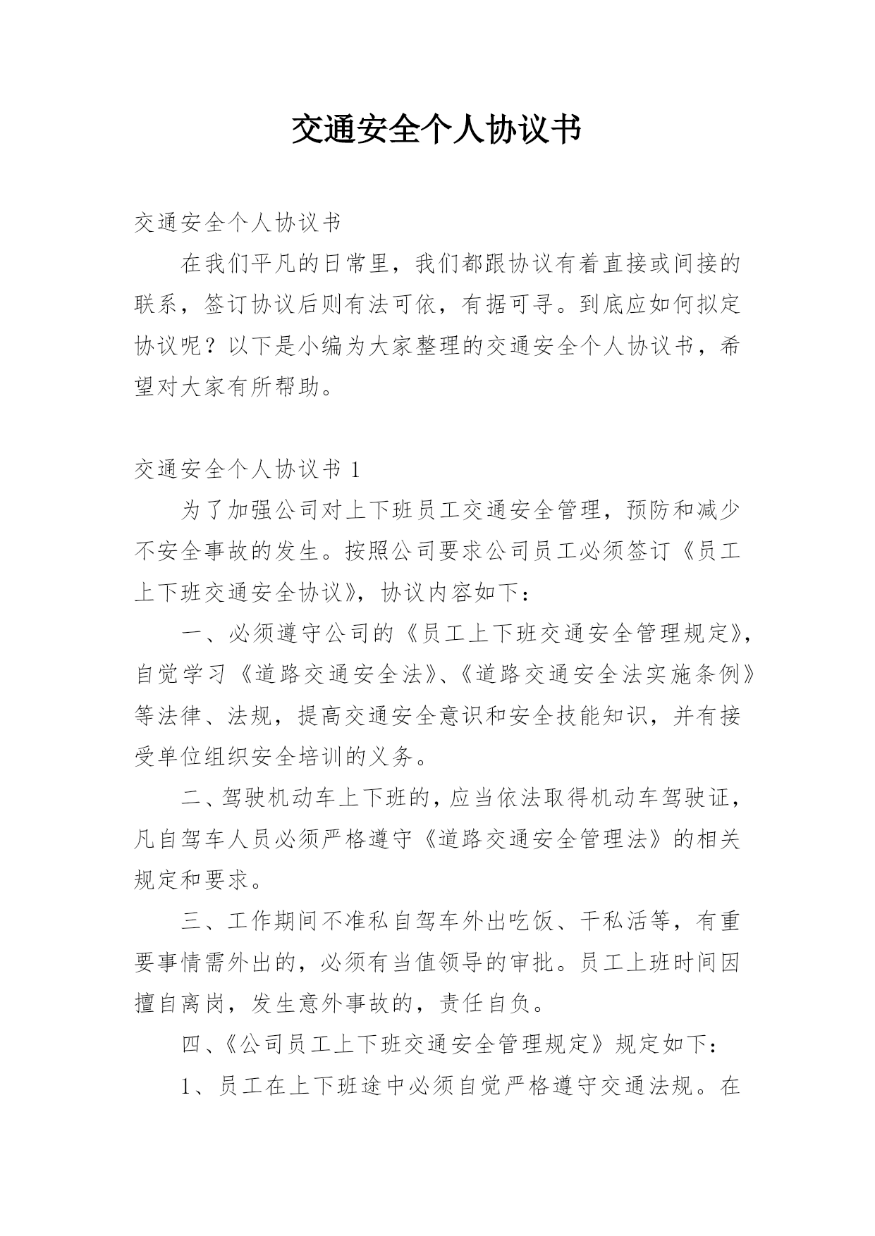 交通安全个人协议书交通安全个人协议书在我们平凡的日常里,我们都跟协议有着直接或间接的联系,签订协议后则有法可依,有据可寻。到底应如何拟定协议呢?以下是小编为大家整理的交通安全个人协议书,希望对大家有所帮助。交通安全个人协议书1为了加强公司对上下班员工交通安全管理,预防和减少不安全事故的发生。按照公司要求公司员工必须签订《员工上下班交通安全协议》,协议内容如下:一、必须遵守公司的《员工上下班交通安全管理规定》,自觉学习《道路交通安全法》、《道路交通安全法实施条例》等法律、法规,提高交通安全意识和安全技能知识