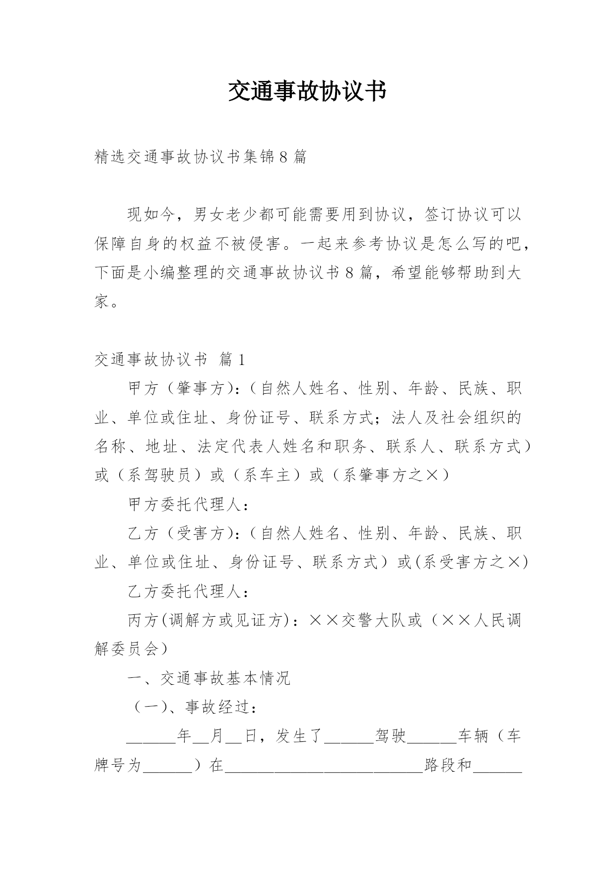 交通事故协议书精选交通事故协议书集锦8篇现如今,男女老少都可能需要用到协议,签订协议可以保障自身的权益不被侵害。一起来参考协议是怎么写的吧,下面是小编整理的交通事故协议书8篇,希望能够帮助到大家。交通事故协议书篇1甲方(肇事方):(自然人姓名、性别、年龄、民族、职业、单位或住址、身份证号、联系方式;法人及社会组织的名称、地址、法定代表人姓名和职务、联系人、联系方式)或(系驾驶员)或(系车主)或(系肇事方之×)甲方委托代理人:乙方(受害方):(自然人姓名、性别、年龄、民族、职业、单位或住址、身份证号、联系方