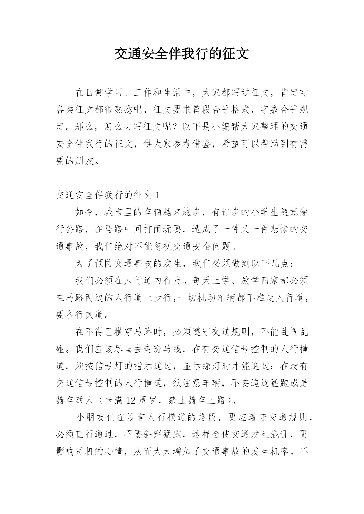 交通安全伴我行的征文在日常学习、工作和生活中,大家都写过征文,肯定对各类征文都很熟悉吧,征文要求篇段合乎格式,字数合乎规定。那么,怎么去写征文呢?以下是小编帮大家整理的交通安全伴我行的征文,供大家参考借鉴,希望可以帮助到有需要的朋友。交通安全伴我行的征文1如今,城市里的车辆越来越多,有许多的小学生随意穿行公路,在马路中间打闹玩耍,造成了一件又一件悲惨的交通事故,我们绝对不能忽视交通安全问题。为了预防交通事故的发生,我们必须做到以下几点:我们必须在人行道内行走。每天上学、放学回家都必须在马路两边的人行道上步