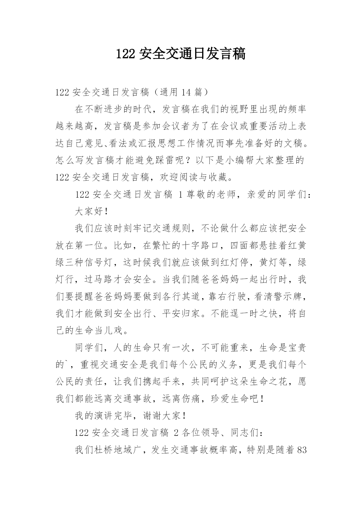 122安全交通日发言稿122安全交通日发言稿(通用14篇)在不断进步的时代,发言稿在我们的视野里出现的频率越来越高,发言稿是参加会议者为了在会议或重要活动上表达自己意见、看法或汇报思想工作情况而事先准备好的文稿。怎么写发言稿才能避免踩雷呢?以下是小编帮大家整理的122安全交通日发言稿,欢迎阅读与收藏。122安全交通日发言稿1尊敬的老师,亲爱的同学们:大家好!我们应该时刻牢记交通规则,不论做什么都应该把安全放在第一位。比如,在繁忙的十字路口,四面都悬挂着红黄绿三种信号灯,这时候我们就应该做到红灯停,黄灯等,