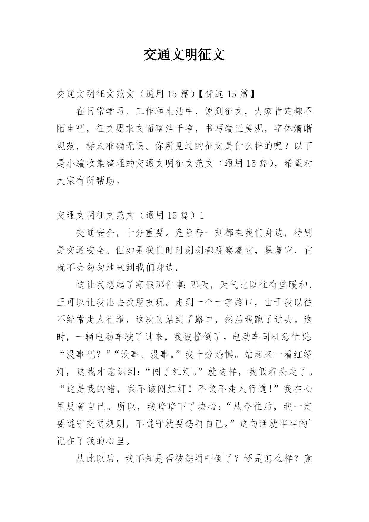 交通文明征文交通文明征文范文(通用15篇)【优选15篇】在日常学习、工作和生活中,说到征文,大家肯定都不陌生吧,征文要求文面整洁干净,书写端正美观,字体清晰规范,标点准确无误。你所见过的征文是什么样的呢?以下是小编收集整理的交通文明征文范文(通用15篇),希望对大家有所帮助。交通文明征文范文(通用15篇)1交通安全,十分重要。危险每一刻都在我们身边,特别是交通安全。但如果我们时时刻刻都观察着它,躲着它,它就不会匆匆地来到我们身边。这让我想起了寒假那件事:那天,天气比以往有些暖和,正可以让我出去找朋友玩。走