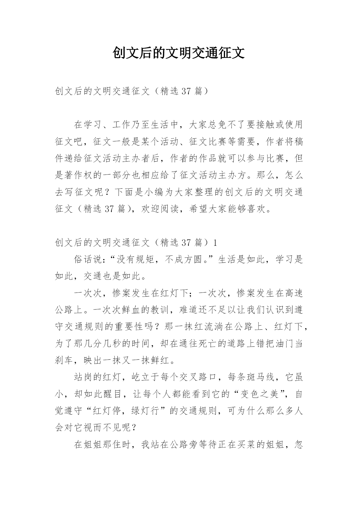创文后的文明交通征文创文后的文明交通征文(精选37篇)在学习、工作乃至生活中,大家总免不了要接触或使用征文吧,征文一般是某个活动、征文比赛等需要,作者将稿件递给征文活动主办者后,作者的作品就可以参与比赛,但是著作权的一部分也相应给了征文活动主办方。那么,怎么去写征文呢?下面是小编为大家整理的创文后的文明交通征文(精选37篇),欢迎阅读,希望大家能够喜欢。创文后的文明交通征文(精选37篇)1俗话说:“没有规矩,不成方圆。”生活是如此,学习是如此,交通也是如此。一次次,惨案发生在红灯下;一次次,惨案发生在高速