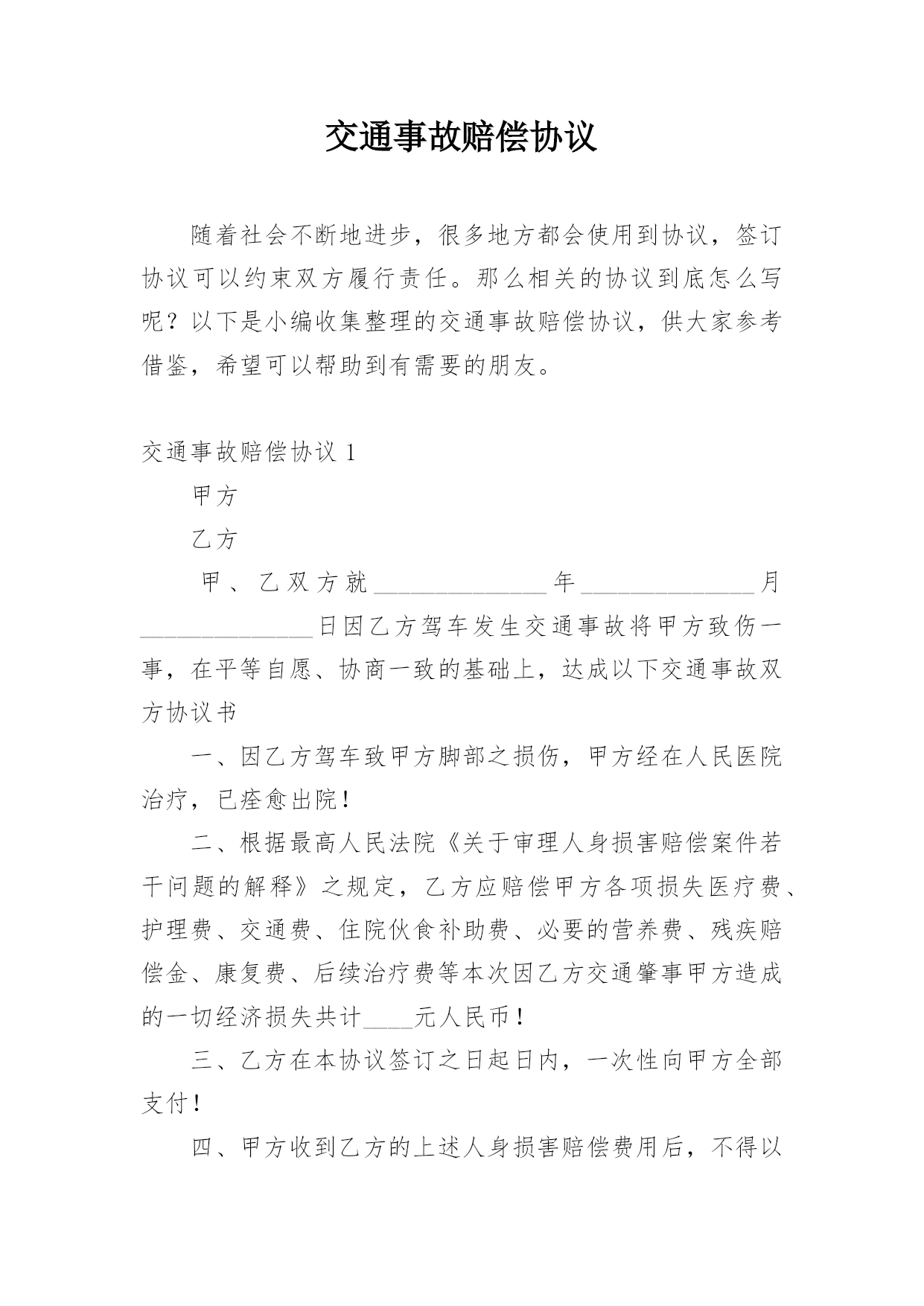 交通事故赔偿协议随着社会不断地进步,很多地方都会使用到协议,签订协议可以约束双方履行责任。那么相关的协议到底怎么写呢?以下是小编收集整理的交通事故赔偿协议,供大家参考借鉴,希望可以帮助到有需要的朋友。交通事故赔偿协议1甲方乙方甲、乙双方就______________年______________月______________日因乙方驾车发生交通事故将甲方致伤一事,在平等自愿、协商一致的基础上,达成以下交通事故双方协议书一、因乙方驾车致甲方脚部之损伤,甲方经在人民医院治疗,已痊愈出院!二、根据最高人民法院《