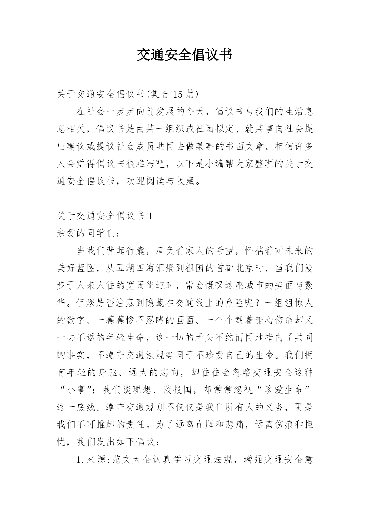 交通安全倡议书关于交通安全倡议书(集合15篇)在社会一步步向前发展的今天,倡议书与我们的生活息息相关,倡议书是由某一组织或社团拟定、就某事向社会提出建议或提议社会成员共同去做某事的书面文章。相信许多人会觉得倡议书很难写吧,以下是小编帮大家整理的关于交通安全倡议书,欢迎阅读与收藏。关于交通安全倡议书1亲爱的同学们:当我们背起行囊,肩负着家人的希望,怀揣着对未来的美好蓝图,从五湖四海汇聚到祖国的首都北京时,当我们漫步于人来人往的宽阔街道时,常会慨叹这座城市的美丽与繁华。但您是否注意到隐藏在交通线上的危险呢?一
