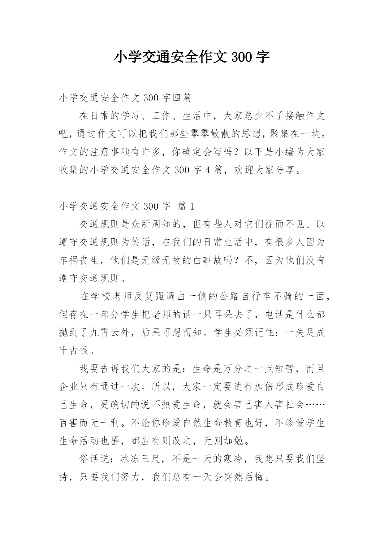 小学交通安全作文300字小学交通安全作文300字四篇在日常的学习、工作、生活中,大家总少不了接触作文吧,通过作文可以把我们那些零零散散的思想,聚集在一块。作文的注意事项有许多,你确定会写吗?以下是小编为大家收集的小学交通安全作文300字4篇,欢迎大家分享。小学交通安全作文300字篇1交通规则是众所周知的,但有些人对它们视而不见。以遵守交通规则为笑话,在我们的日常生活中,有很多人因为车祸丧生,他们是无缘无故的白事故吗?不,因为他们没有遵守交通规则。在学校老师反复强调由一侧的公路自行车不骑的一面,但存在一部分