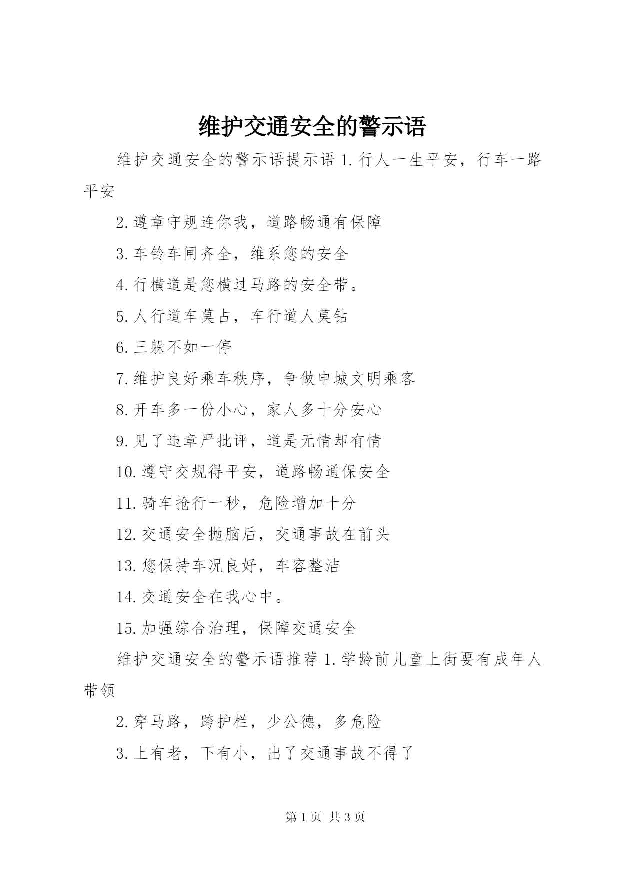 第PAGE\*Arabic\*MERGEFORMAT3页共NUMPAGES\*MERGEFORMAT3页维护交通安全的警示语维护交通安全的警示语提示语1.行人一生平安,行车一路平安2.遵章守规连你我,道路畅通有保障3.车铃车闸齐全,维系您的安全4.行横道是您横过马路的安全带。5.人行道车莫占,车行道人莫钻6.三躲不如一停7.维护良好乘车秩序,争做申城文明乘客8.开车多一份小心,家人多十分安心9.见了违章严批评,道是无情却有情10.遵守交规得平安,道路畅通保安全11.骑车抢行一秒,危险增加十分1