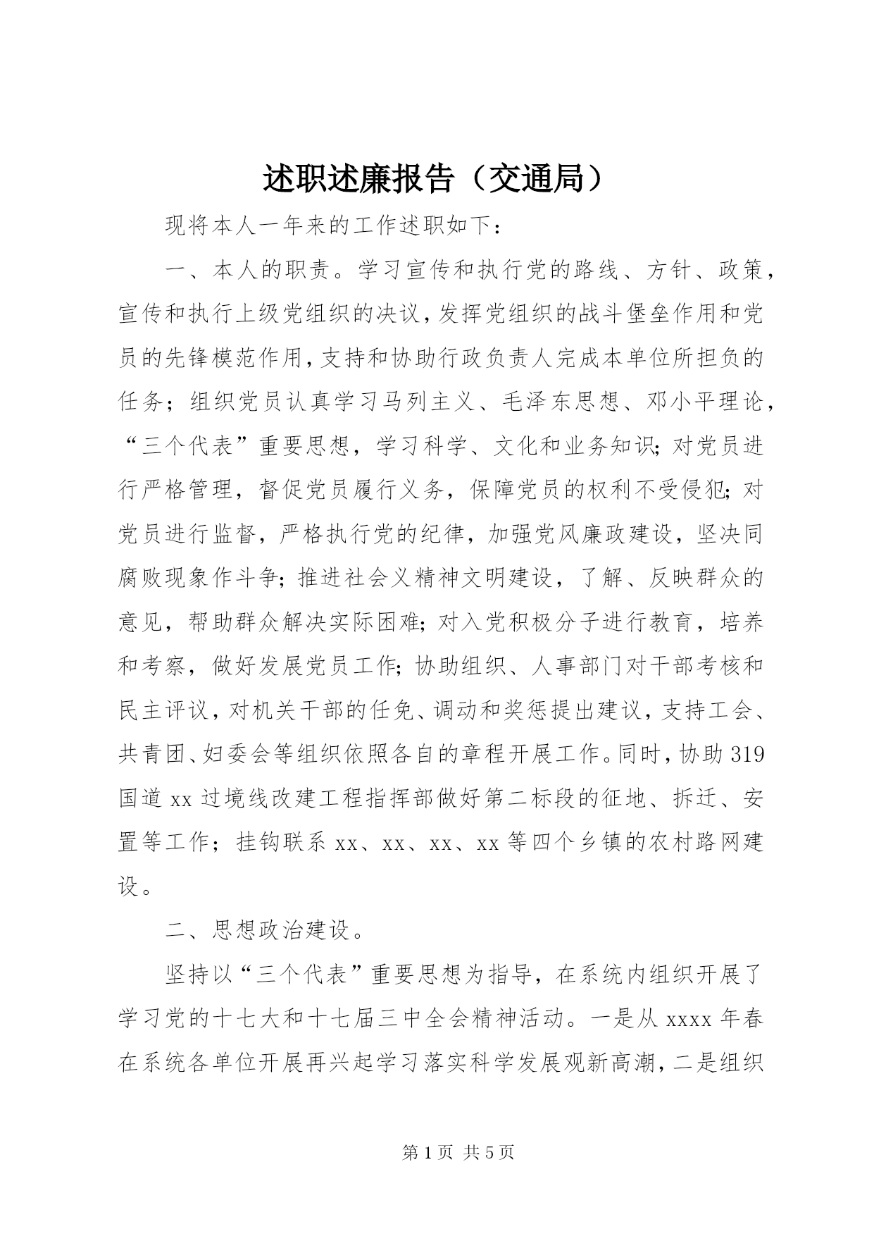 第PAGE\*Arabic\*MERGEFORMAT5页共NUMPAGES\*MERGEFORMAT5页述职述廉报告(交通局)现将本人一年来的工作述职如下:一、本人的职责。学习宣传和执行党的路线、方针、政策,宣传和执行上级党组织的决议,发挥党组织的战斗堡垒作用和党员的先锋模范作用,支持和协助行政负责人完成本单位所担负的任务;组织党员认真学习马列主义、毛泽东思想、邓小平理论,“三个代表”重要思想,学习科学、文化和业务知识;对党员进行严格管理,督促党员履行义务,保障党员的权利不受侵犯;对党员进行监