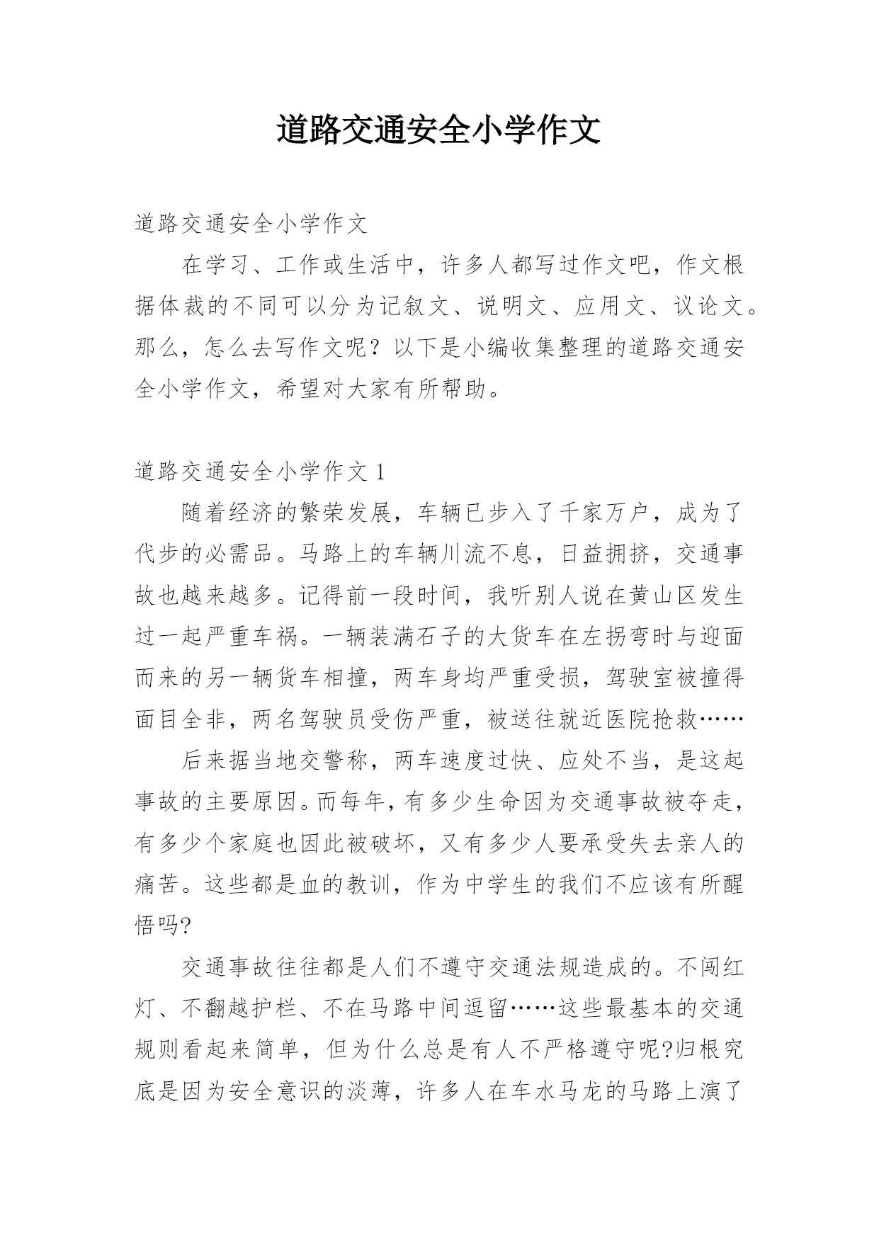 道路交通安全小学作文道路交通安全小学作文在学习、工作或生活中,许多人都写过作文吧,作文根据体裁的不同可以分为记叙文、说明文、应用文、议论文。那么,怎么去写作文呢?以下是小编收集整理的道路交通安全小学作文,希望对大家有所帮助。道路交通安全小学作文1随着经济的繁荣发展,车辆已步入了千家万户,成为了代步的必需品。马路上的车辆川流不息,日益拥挤,交通事故也越来越多。记得前一段时间,我听别人说在黄山区发生过一起严重车祸。一辆装满石子的大货车在左拐弯时与迎面而来的另一辆货车相撞,两车身均严重受损,驾驶室被撞得面目全非