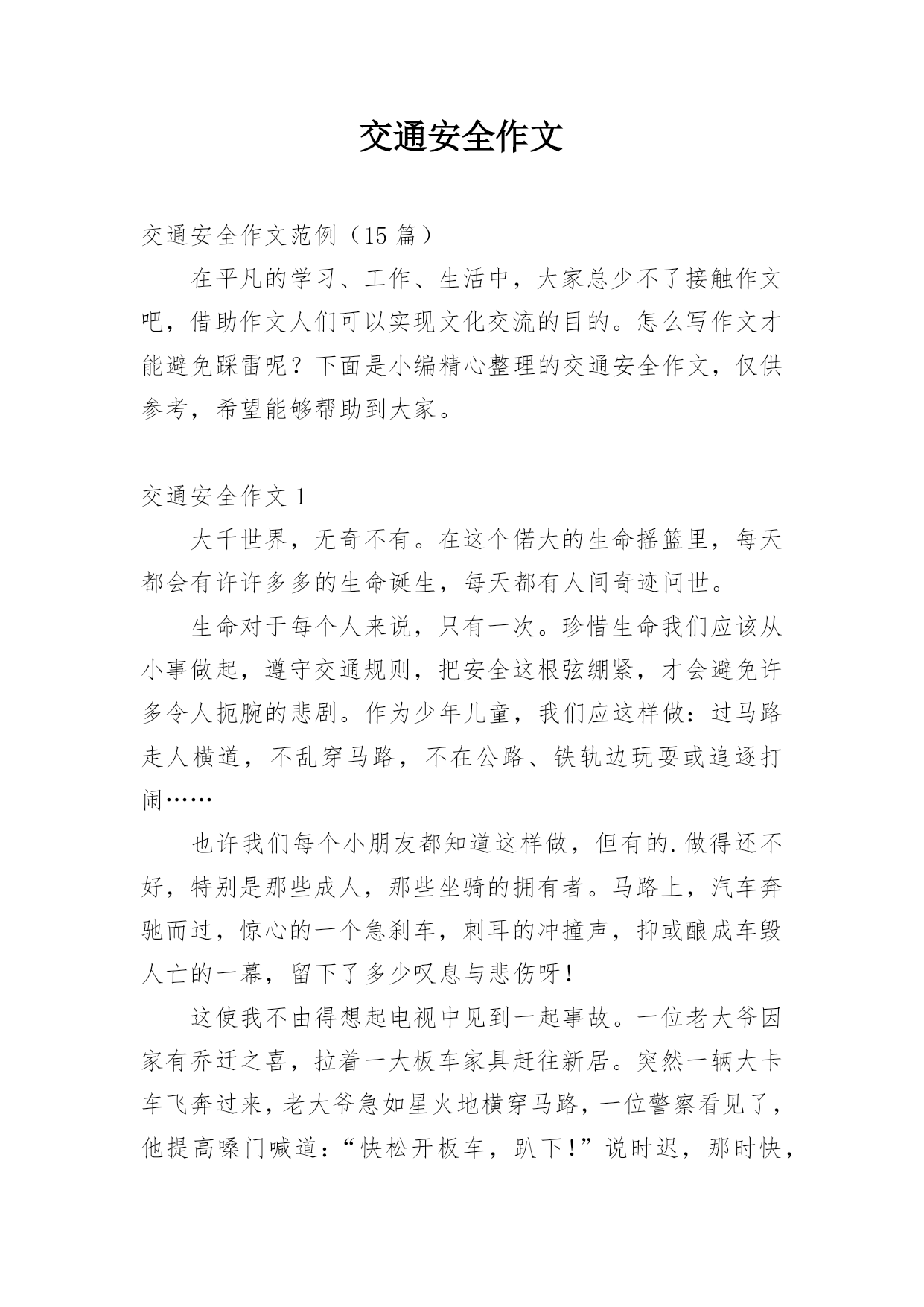 交通安全作文交通安全作文范例(15篇)在平凡的学习、工作、生活中,大家总少不了接触作文吧,借助作文人们可以实现文化交流的目的。怎么写作文才能避免踩雷呢?下面是小编精心整理的交通安全作文,仅供参考,希望能够帮助到大家。交通安全作文1大千世界,无奇不有。在这个偌大的生命摇篮里,每天都会有许许多多的生命诞生,每天都有人间奇迹问世。生命对于每个人来说,只有一次。珍惜生命我们应该从小事做起,遵守交通规则,把安全这根弦绷紧,才会避免许多令人扼腕的悲剧。作为少年儿童,我们应这样做:过马路走人横道,不乱穿马路,不在公路、