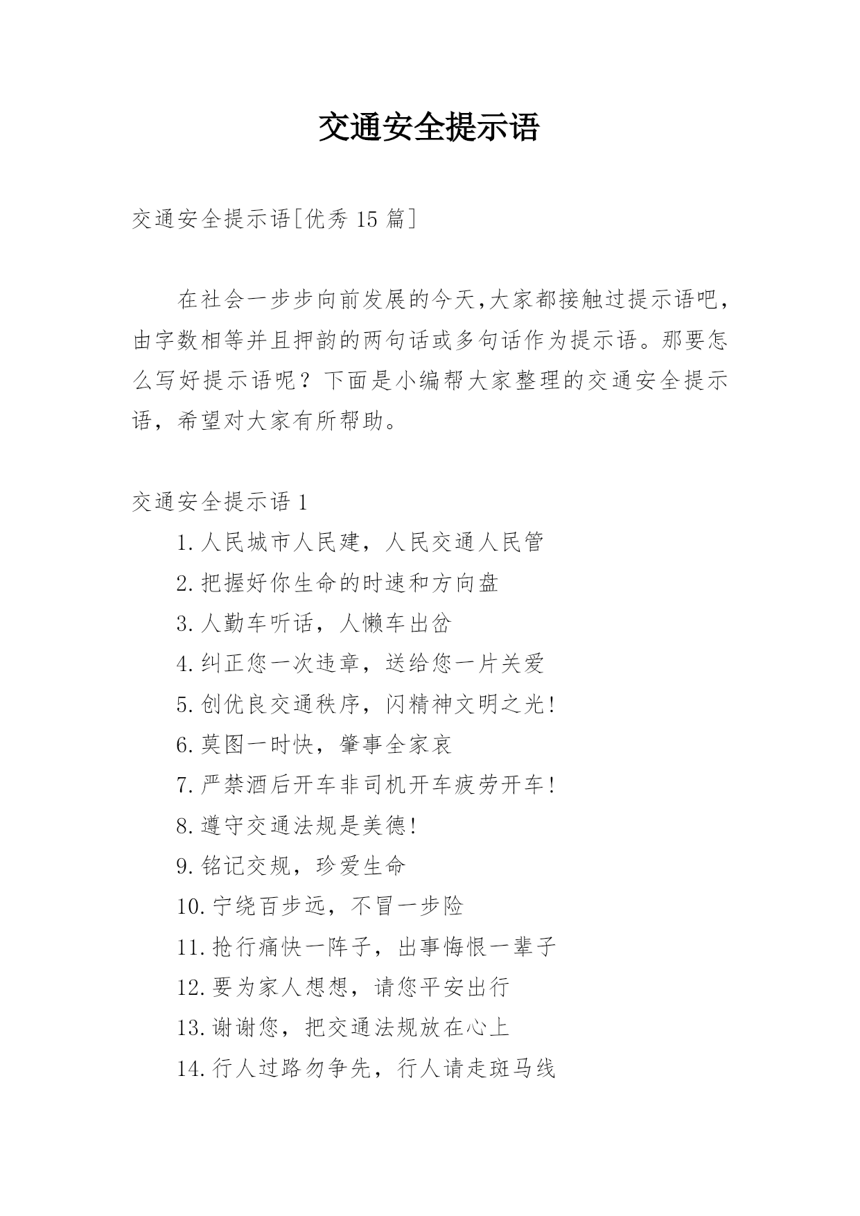 交通安全提示语交通安全提示语[优秀15篇]在社会一步步向前发展的今天,大家都接触过提示语吧,由字数相等并且押韵的两句话或多句话作为提示语。那要怎么写好提示语呢?下面是小编帮大家整理的交通安全提示语,希望对大家有所帮助。交通安全提示语11.人民城市人民建,人民交通人民管2.把握好你生命的时速和方向盘3.人勤车听话,人懒车出岔4.纠正您一次违章,送给您一片关爱5.创优良交通秩序,闪精神文明之光!6.莫图一时快,肇事全家哀7.严禁酒后开车非司机开车疲劳开车!8.遵守交通法规是美德!9.铭记交规,珍爱生命10.宁
