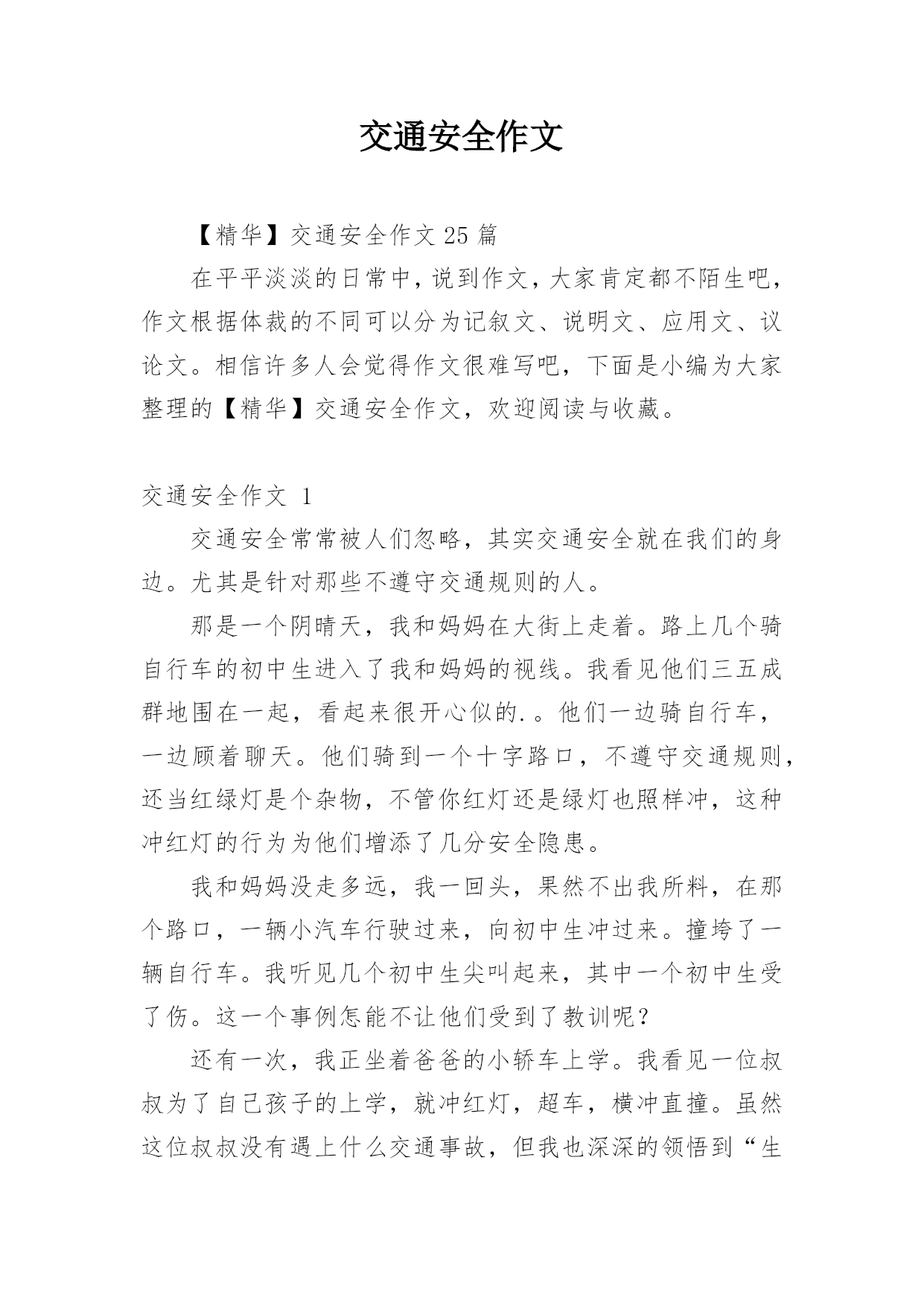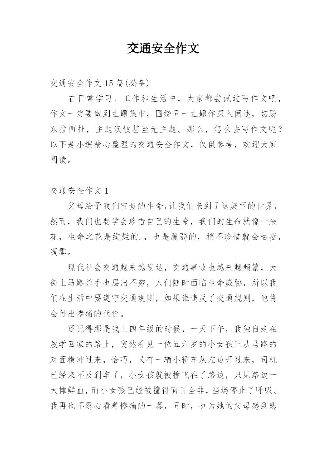 交通安全作文交通安全作文15篇(必备)在日常学习、工作和生活中,大家都尝试过写作文吧,作文一定要做到主题集中,围绕同一主题作深入阐述,切忌东拉西扯,主题涣散甚至无主题。那么,怎么去写作文呢?以下是小编精心整理的交通安全作文,仅供参考,欢迎大家阅读。交通安全作文1父母给予我们宝贵的生命,让我们来到了这美丽的世界,然而,我们也要学会珍惜自己的生命,我们的生命就像一朵花,生命之花是绚烂的.,也是脆弱的,稍不珍惜就会枯萎,凋零。现代社会交通越来越发达,交通事故也越来越频繁,大街上马路杀手也层出不穷,人们随时面临生