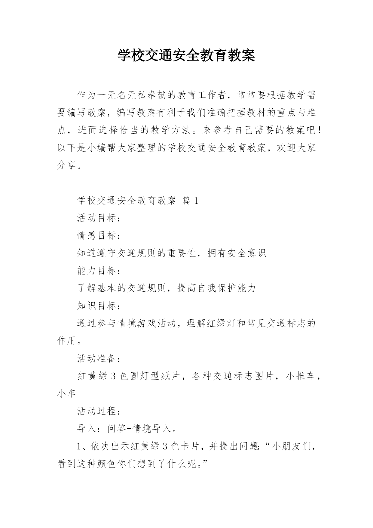 学校交通安全教育教案作为一无名无私奉献的教育工作者,常常要根据教学需要编写教案,编写教案有利于我们准确把握教材的重点与难点,进而选择恰当的教学方法。来参考自己需要的教案吧!以下是小编帮大家整理的学校交通安全教育教案,欢迎大家分享。学校交通安全教育教案篇1活动目标:情感目标:知道遵守交通规则的重要性,拥有安全意识能力目标:了解基本的交通规则,提高自我保护能力知识目标:通过参与情境游戏活动,理解红绿灯和常见交通标志的作用。活动准备:红黄绿3色圆灯型纸片,各种交通标志图片,小推车,小车活动过程:导入:问答+情境