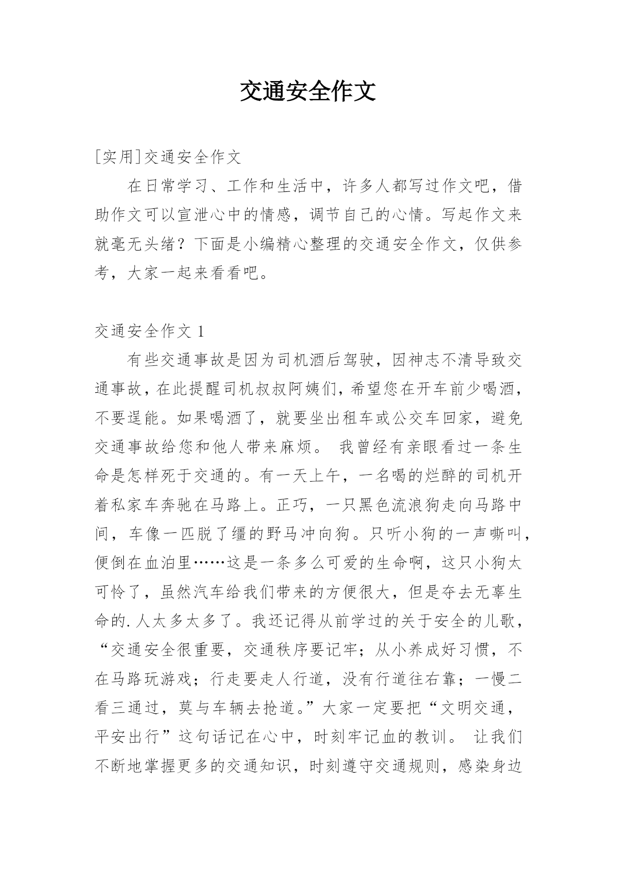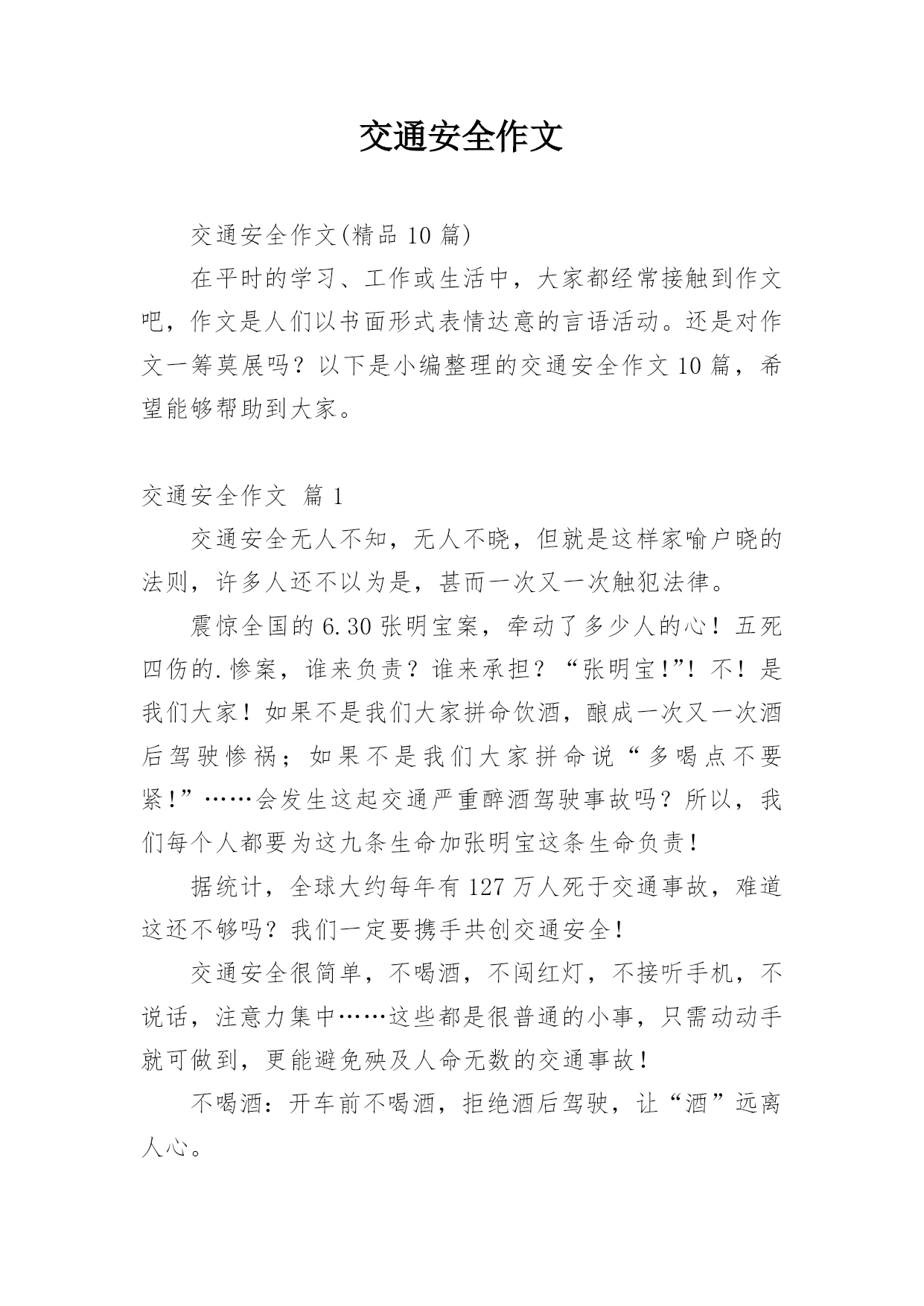 交通安全作文交通安全作文(精品10篇)在平时的学习、工作或生活中,大家都经常接触到作文吧,作文是人们以书面形式表情达意的言语活动。还是对作文一筹莫展吗?以下是小编整理的交通安全作文10篇,希望能够帮助到大家。交通安全作文篇1交通安全无人不知,无人不晓,但就是这样家喻户晓的法则,许多人还不以为是,甚而一次又一次触犯法律。震惊全国的6.30张明宝案,牵动了多少人的心!五死四伤的.惨案,谁来负责?谁来承担?“张明宝!”!不!是我们大家!如果不是我们大家拼命饮酒,酿成一次又一次酒后驾驶惨祸;如果不是我们大家拼命说