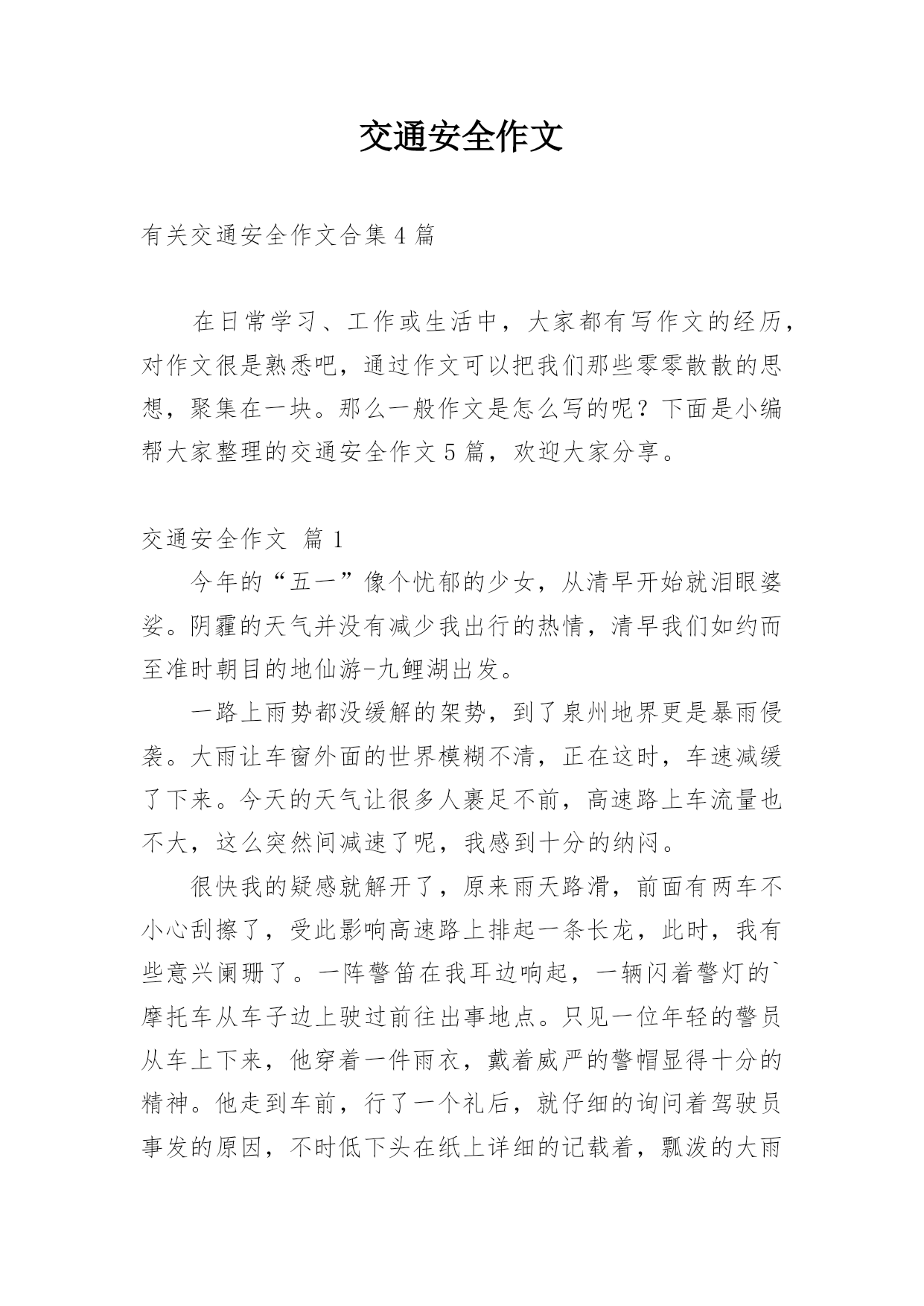 交通安全作文有关交通安全作文合集4篇在日常学习、工作或生活中,大家都有写作文的经历,对作文很是熟悉吧,通过作文可以把我们那些零零散散的思想,聚集在一块。那么一般作文是怎么写的呢?下面是小编帮大家整理的交通安全作文5篇,欢迎大家分享。交通安全作文篇1今年的“五一”像个忧郁的少女,从清早开始就泪眼婆娑。阴霾的天气并没有减少我出行的热情,清早我们如约而至准时朝目的地仙游-九鲤湖出发。一路上雨势都没缓解的架势,到了泉州地界更是暴雨侵袭。大雨让车窗外面的世界模糊不清,正在这时,车速减缓了下来。今天的天气让很多人裹足