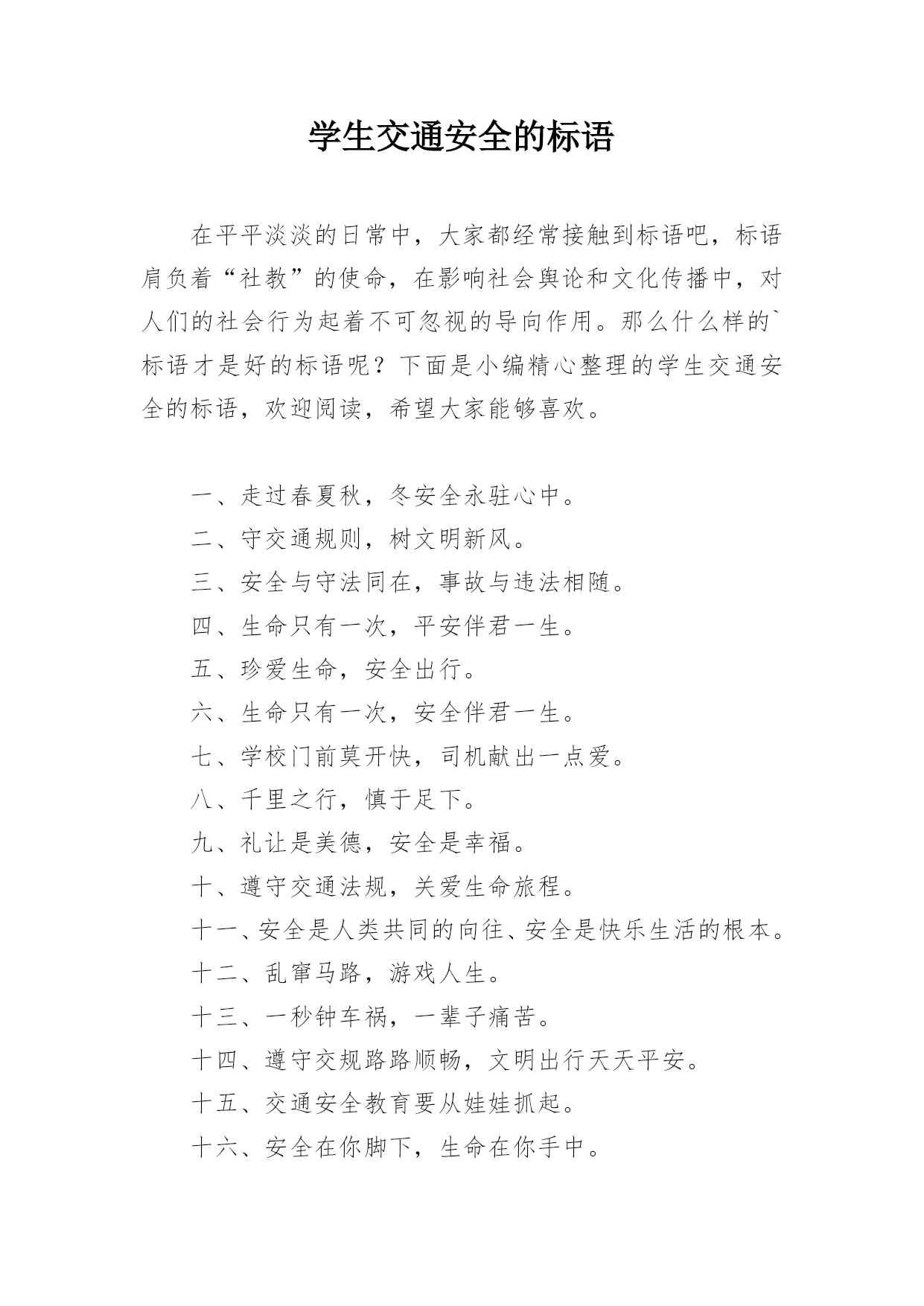 学生交通安全的标语在平平淡淡的日常中,大家都经常接触到标语吧,标语肩负着“社教”的使命,在影响社会舆论和文化传播中,对人们的社会行为起着不可忽视的导向作用。那么什么样的`标语才是好的标语呢?下面是小编精心整理的学生交通安全的标语,欢迎阅读,希望大家能够喜欢。一、走过春夏秋,冬安全永驻心中。二、守交通规则,树文明新风。三、安全与守法同在,事故与违法相随。四、生命只有一次,平安伴君一生。五、珍爱生命,安全出行。六、生命只有一次,安全伴君一生。七、学校门前莫开快,司机献出一点爱。八、千里之行,慎于足下。九、礼让