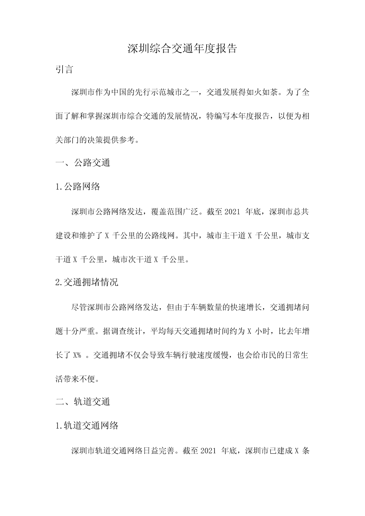 深圳综合交通年度报告引言深圳市作为中国的先行示范城市之一,交通发展得如火如荼。为了全面了解和掌握深圳市综合交通的发展情况,特编写本年度报告,以便为相关部门的决策提供参考。一、公路交通1.公路网络深圳市公路网络发达,覆盖范围广泛。截至2021年底,深圳市总共建设和维护了X千公里的公路线网。其中,城市主干道X千公里,城市支干道X千公里,城市次干道X千公里。2.交通拥堵情况尽管深圳市公路网络发达,但由于车辆数量的快速增长,交通拥堵问题十分严重。据调查统计,平均每天交通拥堵时间约为X小时,比去年增长了X%。交通拥