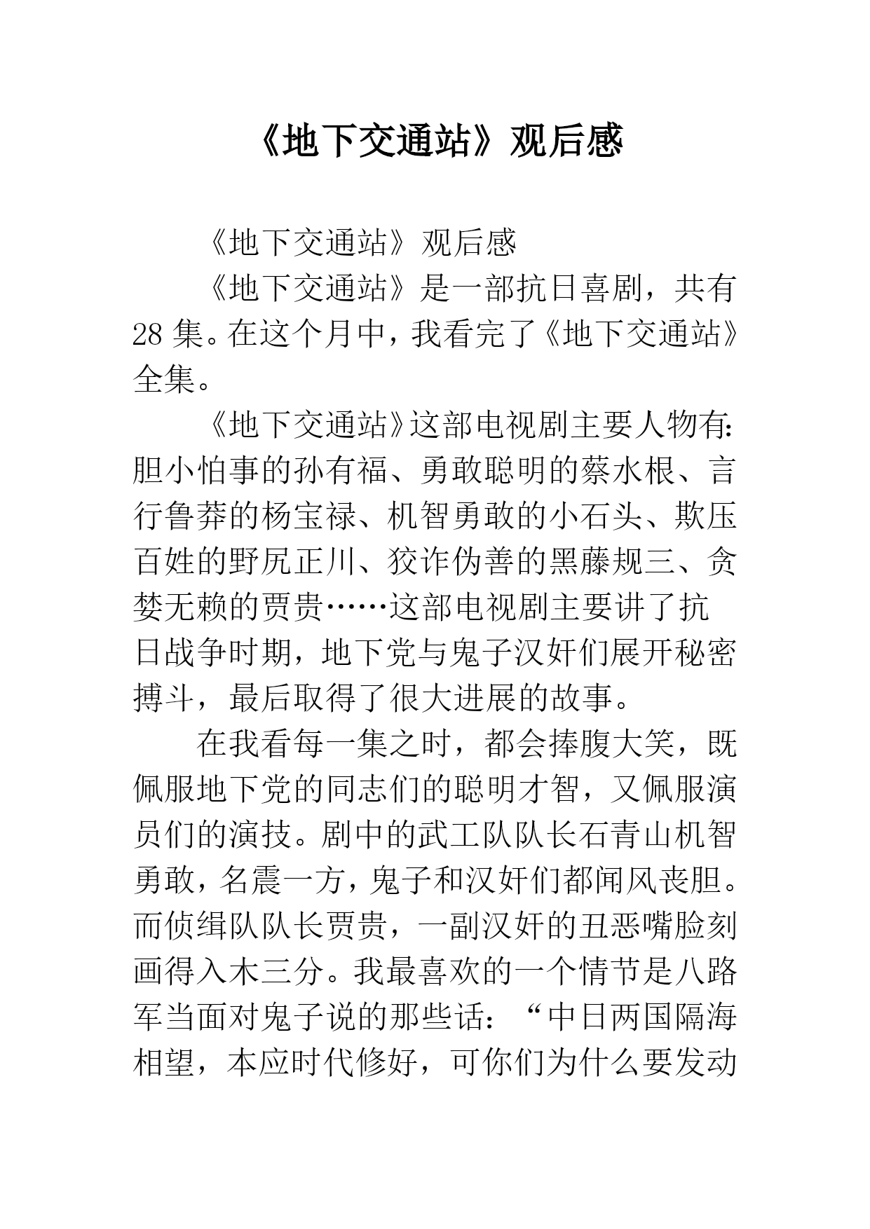 《地下交通站》观后感《地下交通站》观后感《地下交通站》是一部抗日喜剧,共有28集。在这个月中,我看完了《地下交通站》全集。《地下交通站》这部电视剧主要人物有:胆小怕事的孙有福、勇敢聪明的蔡水根、言行鲁莽的杨宝禄、机智勇敢的小石头、欺压百姓的野尻正川、狡诈伪善的黑藤规三、贪婪无赖的贾贵……这部电视剧主要讲了抗日战争时期,地下党与鬼子汉奸们展开秘密搏斗,最后取得了很大进展的故事。在我看每一集之时,都会捧腹大笑,既佩服地下党的同志们的聪明才智,又佩服演员们的演技。剧中的武工队队长石青山机智勇敢,名震一方,鬼子和