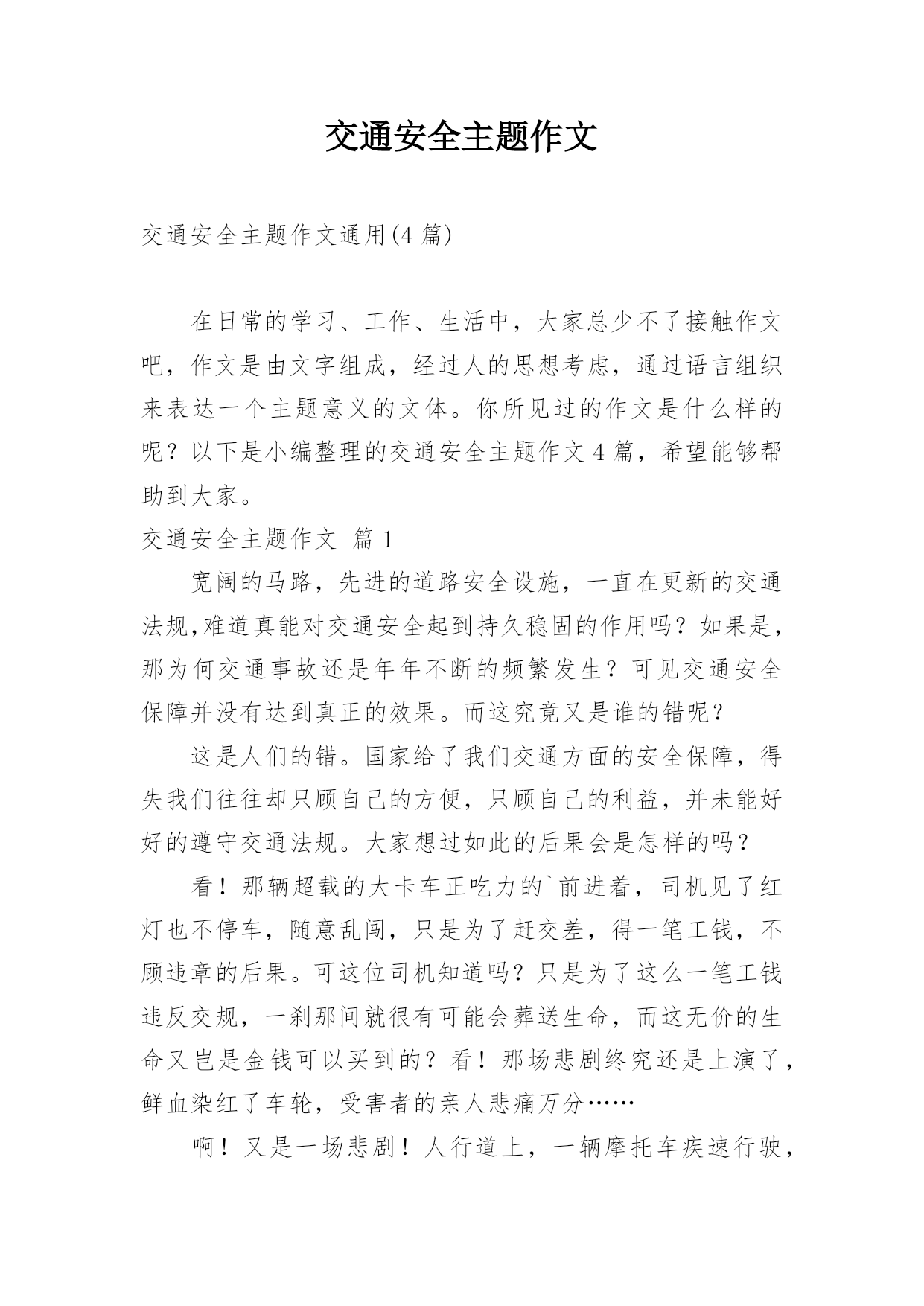 交通安全主题作文交通安全主题作文通用(4篇)在日常的学习、工作、生活中,大家总少不了接触作文吧,作文是由文字组成,经过人的思想考虑,通过语言组织来表达一个主题意义的文体。你所见过的作文是什么样的呢?以下是小编整理的交通安全主题作文4篇,希望能够帮助到大家。交通安全主题作文篇1宽阔的马路,先进的道路安全设施,一直在更新的交通法规,难道真能对交通安全起到持久稳固的作用吗?如果是,那为何交通事故还是年年不断的频繁发生?可见交通安全保障并没有达到真正的效果。而这究竟又是谁的错呢?这是人们的错。国家给了我们交通方面