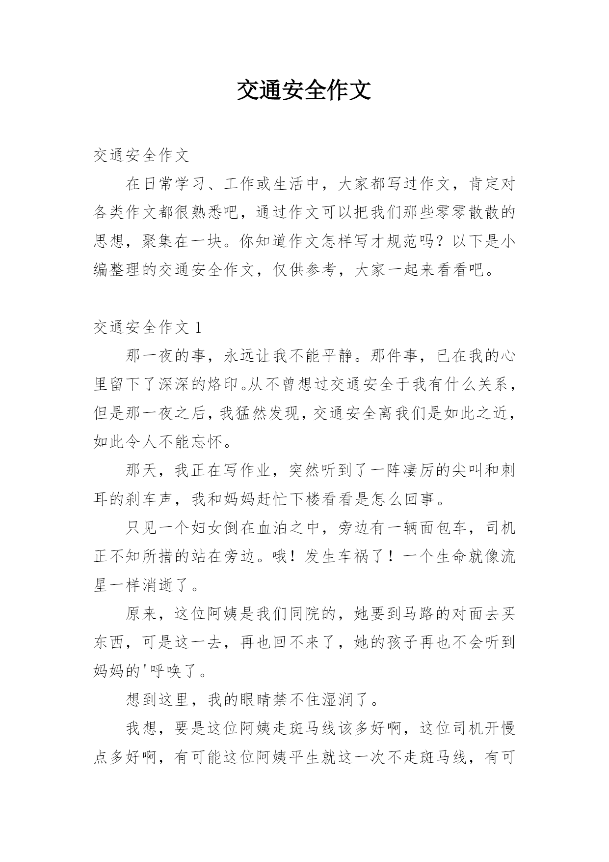 交通安全作文交通安全作文在日常学习、工作或生活中,大家都写过作文,肯定对各类作文都很熟悉吧,通过作文可以把我们那些零零散散的思想,聚集在一块。你知道作文怎样写才规范吗?以下是小编整理的交通安全作文,仅供参考,大家一起来看看吧。交通安全作文1那一夜的事,永远让我不能平静。那件事,已在我的心里留下了深深的烙印。从不曾想过交通安全于我有什么关系,但是那一夜之后,我猛然发现,交通安全离我们是如此之近,如此令人不能忘怀。那天,我正在写作业,突然听到了一阵凄厉的尖叫和刺耳的刹车声,我和妈妈赶忙下楼看看是怎么回事。只见