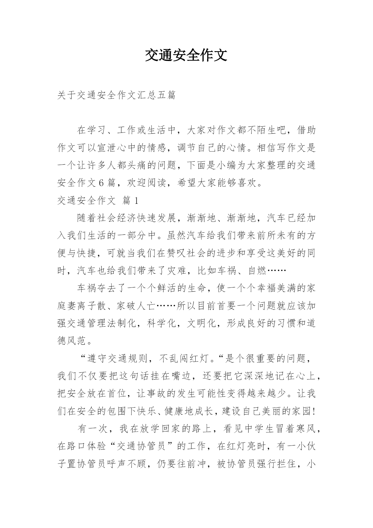 交通安全作文关于交通安全作文汇总五篇在学习、工作或生活中,大家对作文都不陌生吧,借助作文可以宣泄心中的情感,调节自己的心情。相信写作文是一个让许多人都头痛的问题,下面是小编为大家整理的交通安全作文6篇,欢迎阅读,希望大家能够喜欢。交通安全作文篇1随着社会经济快速发展,渐渐地、渐渐地,汽车已经加入我们生活的一部分中。虽然汽车给我们带来前所未有的方便与快捷,可就当我们在赞叹社会的进步和享受这美好的同时,汽车也给我们带来了灾难,比如车祸、自燃……车祸夺去了一个个鲜活的生命,使一个个幸福美满的家庭妻离子散、家破人