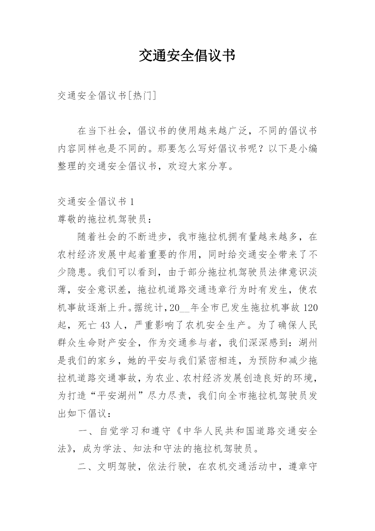 交通安全倡议书交通安全倡议书[热门]在当下社会,倡议书的使用越来越广泛,不同的倡议书内容同样也是不同的。那要怎么写好倡议书呢?以下是小编整理的交通安全倡议书,欢迎大家分享。交通安全倡议书1尊敬的拖拉机驾驶员:随着社会的不断进步,我市拖拉机拥有量越来越多,在农村经济发展中起着重要的作用,同时给交通安全带来了不少隐患。我们可以看到,由于部分拖拉机驾驶员法律意识淡薄,安全意识差,拖拉机道路交通违章行为时有发生,使农机事故逐渐上升。据统计,20__年全市已发生拖拉机事故120起,死亡43人,严重影响了农机安全生产