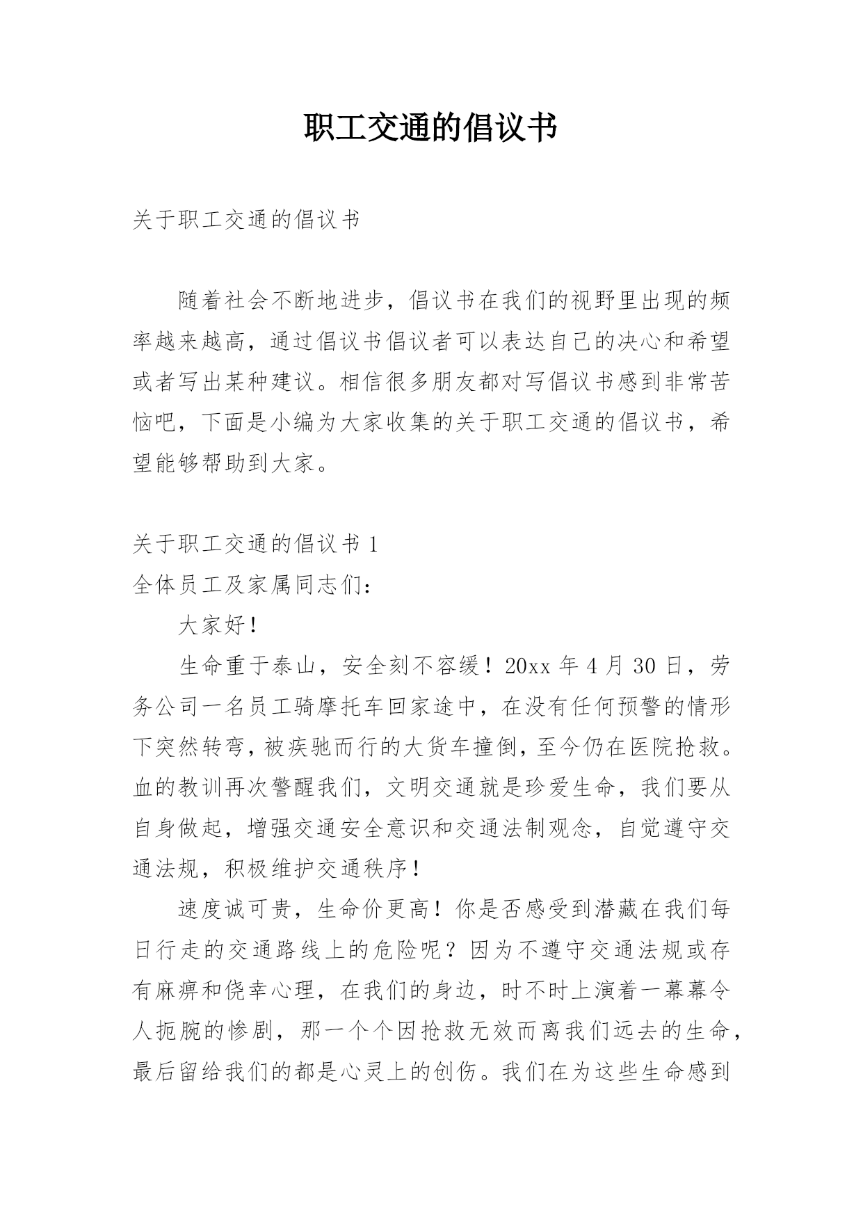 职工交通的倡议书关于职工交通的倡议书随着社会不断地进步,倡议书在我们的视野里出现的频率越来越高,通过倡议书倡议者可以表达自己的决心和希望或者写出某种建议。相信很多朋友都对写倡议书感到非常苦恼吧,下面是小编为大家收集的关于职工交通的倡议书,希望能够帮助到大家。关于职工交通的倡议书1全体员工及家属同志们:大家好!生命重于泰山,安全刻不容缓!20xx年4月30日,劳务公司一名员工骑摩托车回家途中,在没有任何预警的情形下突然转弯,被疾驰而行的大货车撞倒,至今仍在医院抢救。血的教训再次警醒我们,文明交通就是珍爱生命