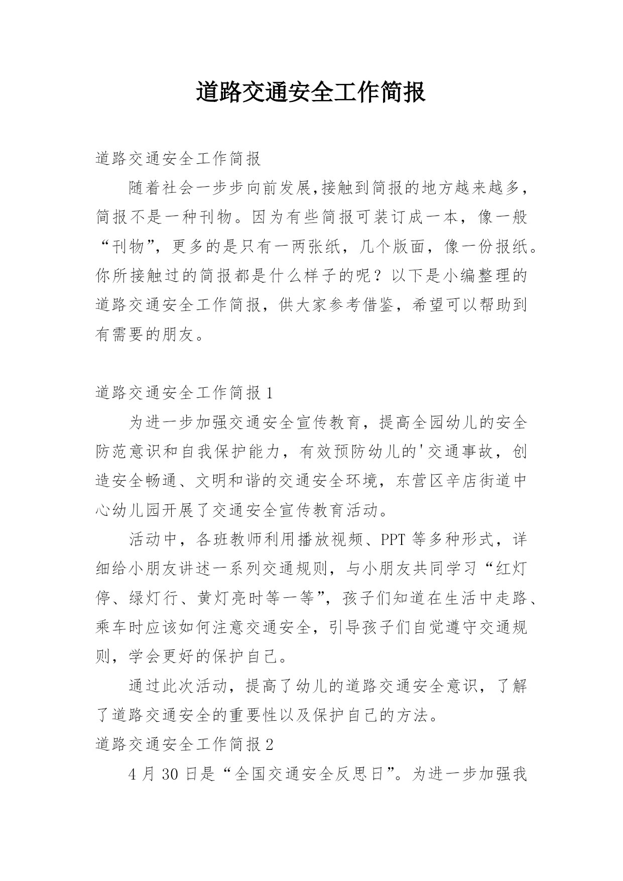道路交通安全工作简报道路交通安全工作简报随着社会一步步向前发展,接触到简报的地方越来越多,简报不是一种刊物。因为有些简报可装订成一本,像一般“刊物”,更多的是只有一两张纸,几个版面,像一份报纸。你所接触过的简报都是什么样子的呢?以下是小编整理的道路交通安全工作简报,供大家参考借鉴,希望可以帮助到有需要的朋友。道路交通安全工作简报1为进一步加强交通安全宣传教育,提高全园幼儿的安全防范意识和自我保护能力,有效预防幼儿的'交通事故,创造安全畅通、文明和谐的交通安全环境,东营区辛店街道中心幼儿园开展了交通安全宣传