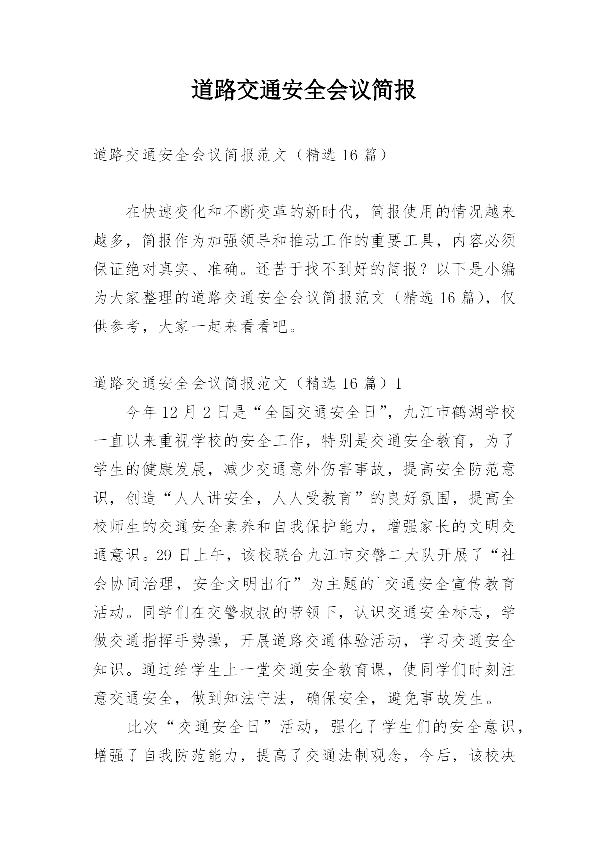 道路交通安全会议简报道路交通安全会议简报范文(精选16篇)在快速变化和不断变革的新时代,简报使用的情况越来越多,简报作为加强领导和推动工作的重要工具,内容必须保证绝对真实、准确。还苦于找不到好的简报?以下是小编为大家整理的道路交通安全会议简报范文(精选16篇),仅供参考,大家一起来看看吧。道路交通安全会议简报范文(精选16篇)1今年12月2日是“全国交通安全日”,九江市鹤湖学校一直以来重视学校的安全工作,特别是交通安全教育,为了学生的健康发展,减少交通意外伤害事故,提高安全防范意识,创造“人人讲安全,人人