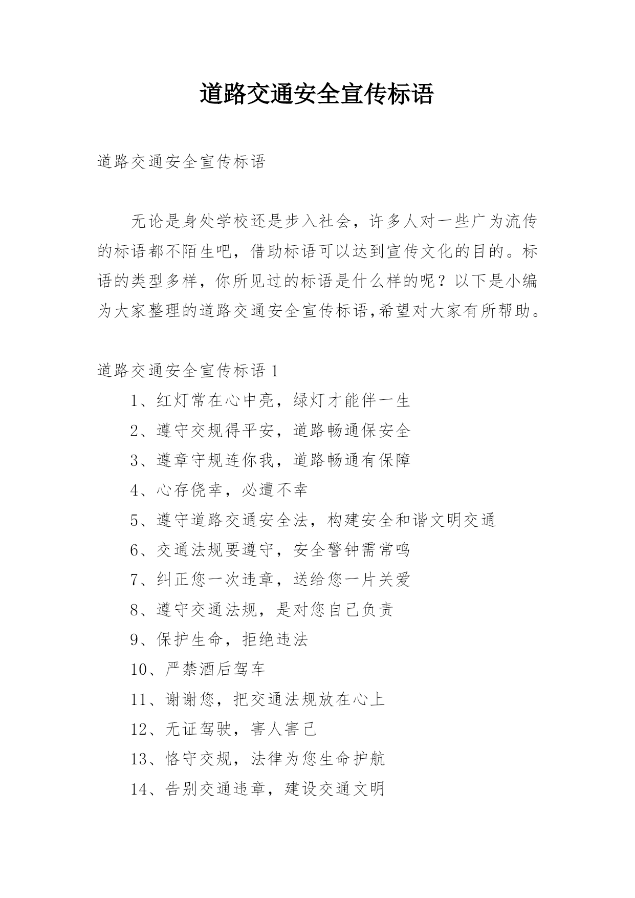 道路交通安全宣传标语道路交通安全宣传标语无论是身处学校还是步入社会,许多人对一些广为流传的标语都不陌生吧,借助标语可以达到宣传文化的目的。标语的类型多样,你所见过的标语是什么样的呢?以下是小编为大家整理的道路交通安全宣传标语,希望对大家有所帮助。道路交通安全宣传标语11、红灯常在心中亮,绿灯才能伴一生2、遵守交规得平安,道路畅通保安全3、遵章守规连你我,道路畅通有保障4、心存侥幸,必遭不幸5、遵守道路交通安全法,构建安全和谐文明交通6、交通法规要遵守,安全警钟需常鸣7、纠正您一次违章,送给您一片关爱8、遵