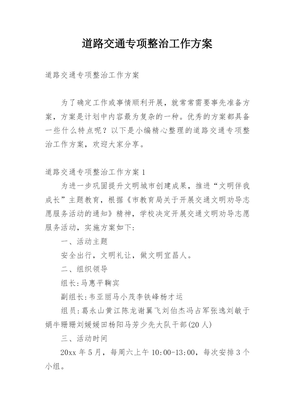道路交通专项整治工作方案道路交通专项整治工作方案为了确定工作或事情顺利开展,就常常需要事先准备方案,方案是计划中内容最为复杂的一种。优秀的方案都具备一些什么特点呢?以下是小编精心整理的道路交通专项整治工作方案,欢迎大家分享。道路交通专项整治工作方案1为进一步巩固提升文明城市创建成果,推进“文明伴我成长”主题教育,根据《市教育局关于开展交通文明劝导志愿服务活动的通知》精神,学校决定开展交通文明劝导志愿服务活动,实施方案如下:一、活动主题安全出行,文明礼让,做文明宜昌人。二、组织领导组长:马惠平鞠宾副组长:韦