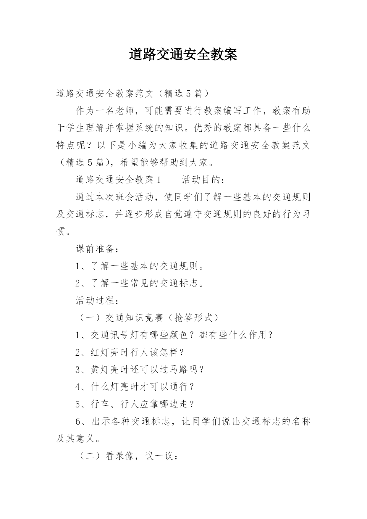 道路交通安全教案道路交通安全教案范文(精选5篇)作为一名老师,可能需要进行教案编写工作,教案有助于学生理解并掌握系统的知识。优秀的教案都具备一些什么特点呢?以下是小编为大家收集的道路交通安全教案范文(精选5篇),希望能够帮助到大家。道路交通安全教案1活动目的:通过本次班会活动,使同学们了解一些基本的交通规则及交通标志,并逐步形成自觉遵守交通规则的良好的行为习惯。课前准备:1、了解一些基本的交通规则。2、了解一些常见的交通标志。活动过程:(一)交通知识竞赛(抢答形式)1、交通讯号灯有哪些颜色?都有些什么作用