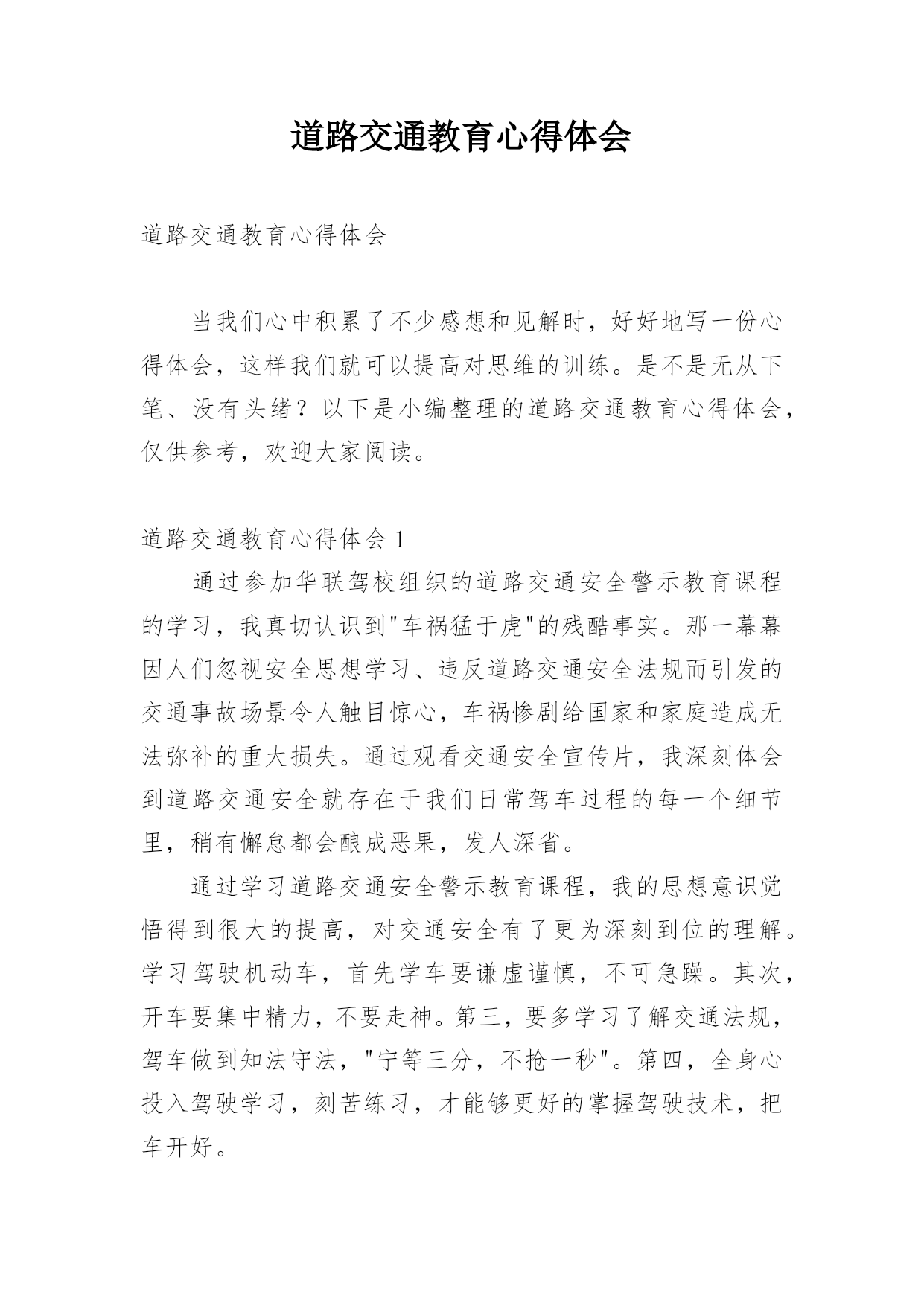 道路交通教育心得体会道路交通教育心得体会当我们心中积累了不少感想和见解时,好好地写一份心得体会,这样我们就可以提高对思维的训练。是不是无从下笔、没有头绪?以下是小编整理的道路交通教育心得体会,仅供参考,欢迎大家阅读。道路交通教育心得体会1通过参加华联驾校组织的道路交通安全警示教育课程的学习,我真切认识到"车祸猛于虎"的残酷事实。那一幕幕因人们忽视安全思想学习、违反道路交通安全法规而引发的交通事故场景令人触目惊心,车祸惨剧给国家和家庭造成无法弥补的重大损失。通过观看交通安全宣传片,我深刻体会到道路交通安全就