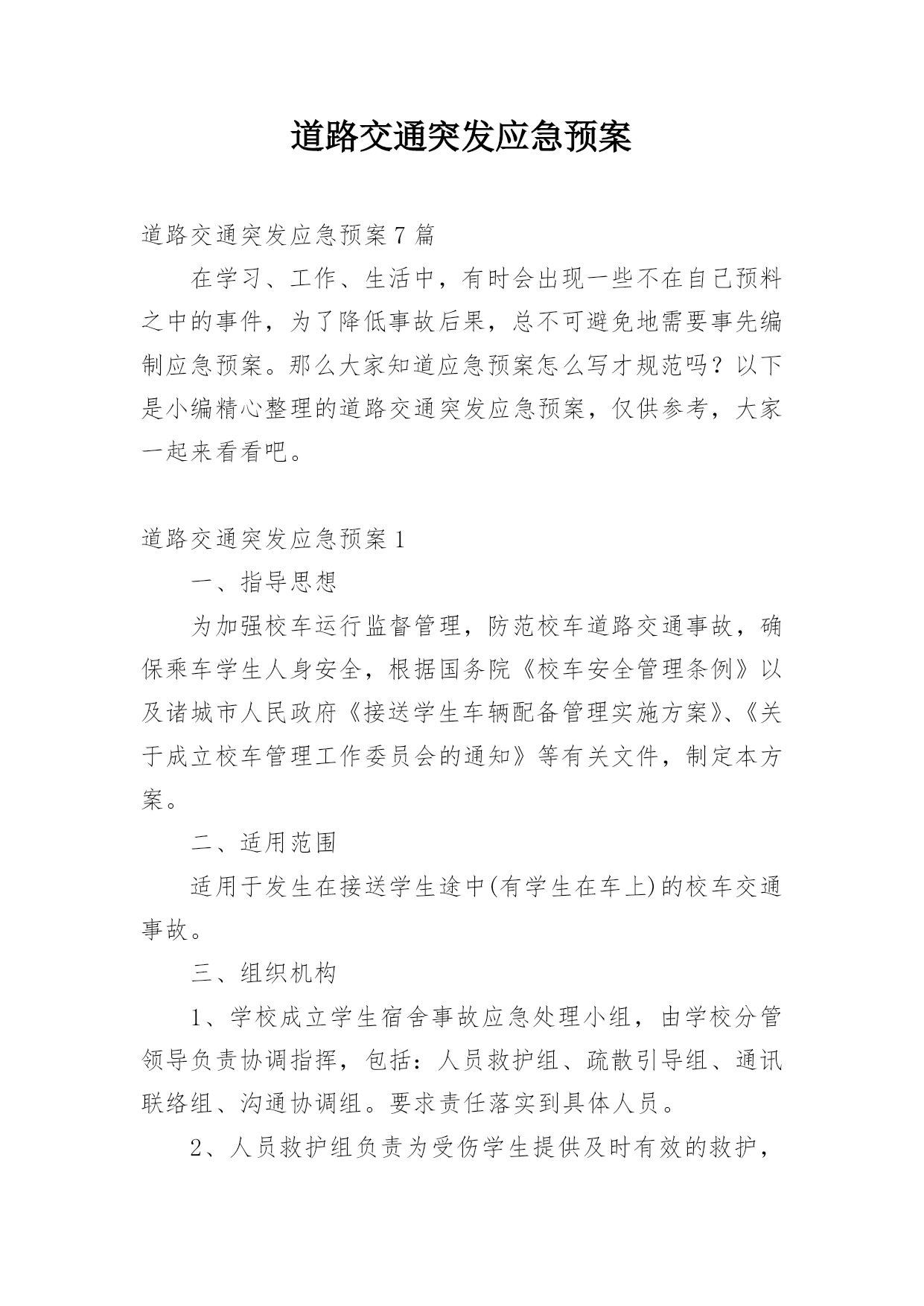 道路交通突发应急预案道路交通突发应急预案7篇在学习、工作、生活中,有时会出现一些不在自己预料之中的事件,为了降低事故后果,总不可避免地需要事先编制应急预案。那么大家知道应急预案怎么写才规范吗?以下是小编精心整理的道路交通突发应急预案,仅供参考,大家一起来看看吧。道路交通突发应急预案1一、指导思想为加强校车运行监督管理,防范校车道路交通事故,确保乘车学生人身安全,根据国务院《校车安全管理条例》以及诸城市人民政府《接送学生车辆配备管理实施方案》、《关于成立校车管理工作委员会的通知》等有关文件,制定本方案。二、