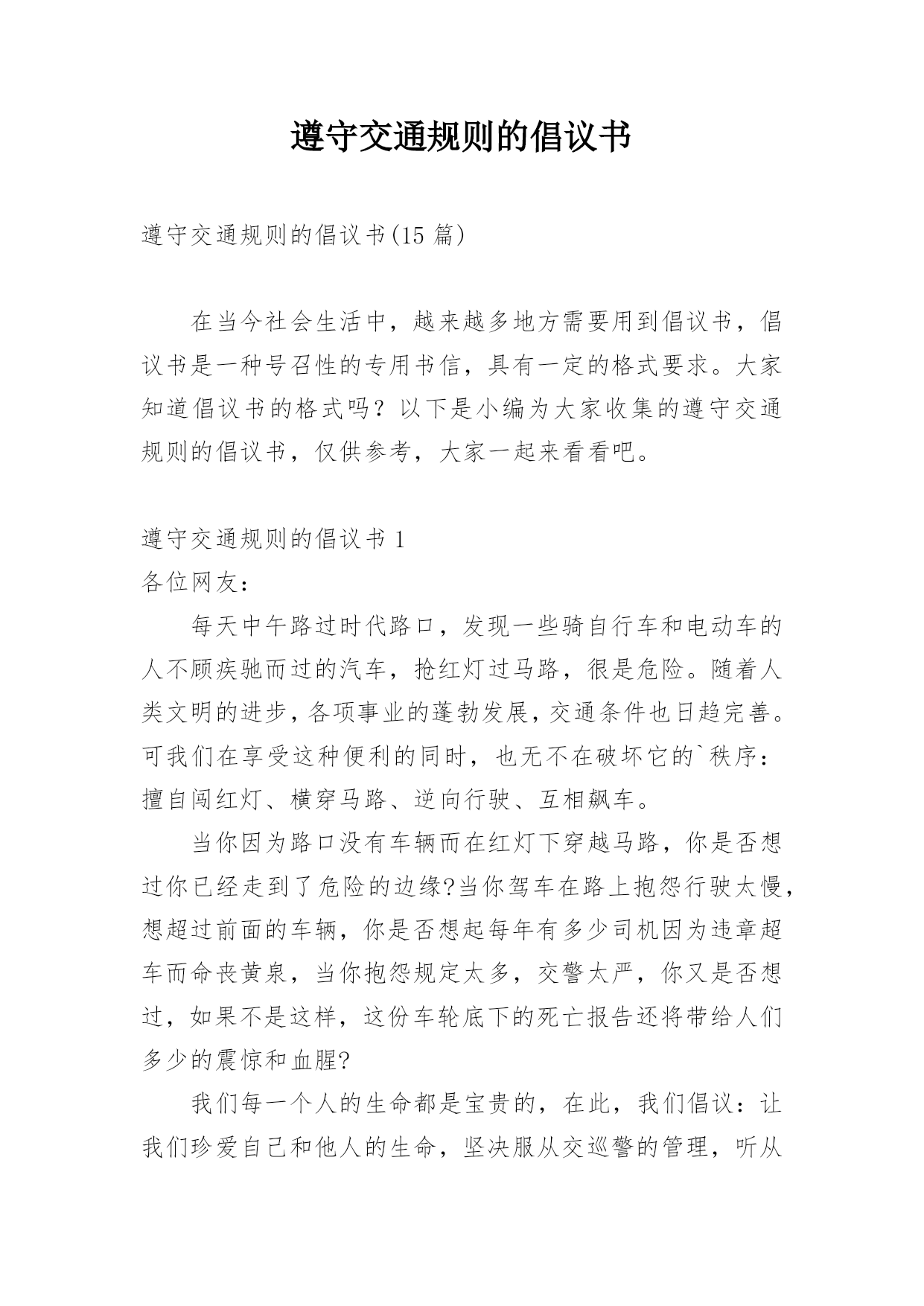 遵守交通规则的倡议书遵守交通规则的倡议书(15篇)在当今社会生活中,越来越多地方需要用到倡议书,倡议书是一种号召性的专用书信,具有一定的格式要求。大家知道倡议书的格式吗?以下是小编为大家收集的遵守交通规则的倡议书,仅供参考,大家一起来看看吧。遵守交通规则的倡议书1各位网友:每天中午路过时代路口,发现一些骑自行车和电动车的人不顾疾驰而过的汽车,抢红灯过马路,很是危险。随着人类文明的进步,各项事业的蓬勃发展,交通条件也日趋完善。可我们在享受这种便利的同时,也无不在破坏它的`秩序:擅自闯红灯、横穿马路、逆向行驶