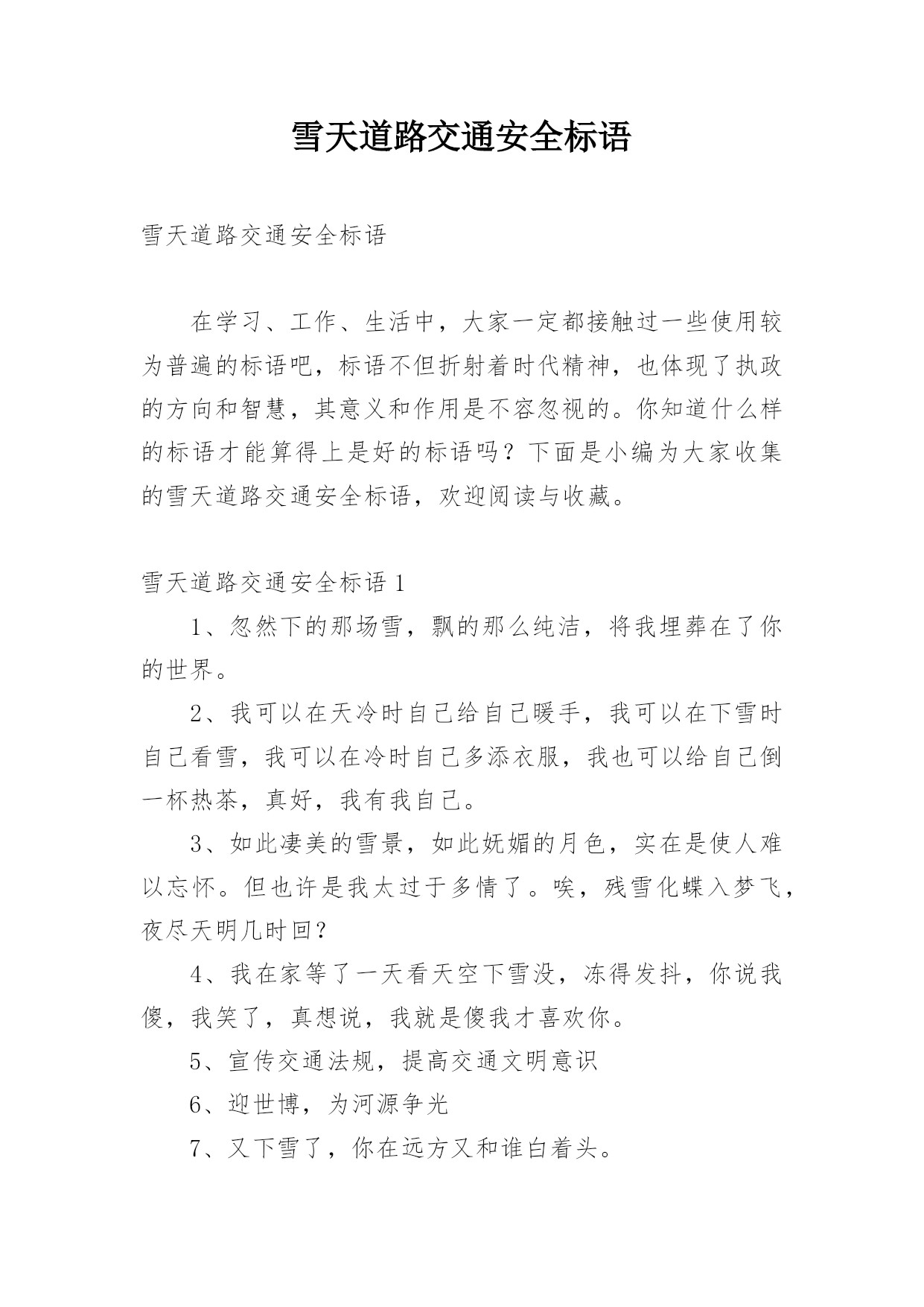 雪天道路交通安全标语雪天道路交通安全标语在学习、工作、生活中,大家一定都接触过一些使用较为普遍的标语吧,标语不但折射着时代精神,也体现了执政的方向和智慧,其意义和作用是不容忽视的。你知道什么样的标语才能算得上是好的标语吗?下面是小编为大家收集的雪天道路交通安全标语,欢迎阅读与收藏。雪天道路交通安全标语11、忽然下的那场雪,飘的那么纯洁,将我埋葬在了你的世界。2、我可以在天冷时自己给自己暖手,我可以在下雪时自己看雪,我可以在冷时自己多添衣服,我也可以给自己倒一杯热茶,真好,我有我自己。3、如此凄美的雪景,如