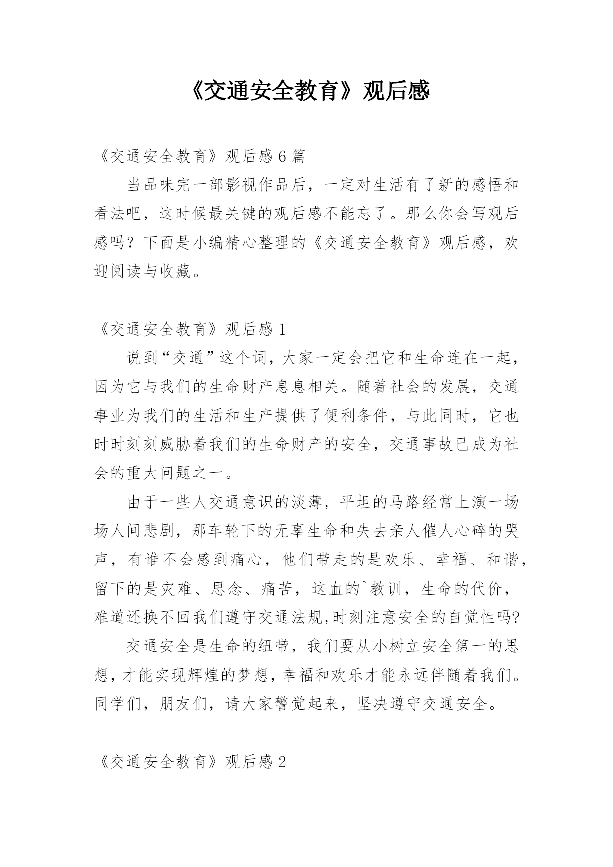 《交通安全教育》观后感《交通安全教育》观后感6篇当品味完一部影视作品后,一定对生活有了新的感悟和看法吧,这时候最关键的观后感不能忘了。那么你会写观后感吗?下面是小编精心整理的《交通安全教育》观后感,欢迎阅读与收藏。《交通安全教育》观后感1说到“交通”这个词,大家一定会把它和生命连在一起,因为它与我们的生命财产息息相关。随着社会的发展,交通事业为我们的生活和生产提供了便利条件,与此同时,它也时时刻刻威胁着我们的生命财产的安全,交通事故已成为社会的重大问题之一。由于一些人交通意识的淡薄,平坦的马路经常上演一场