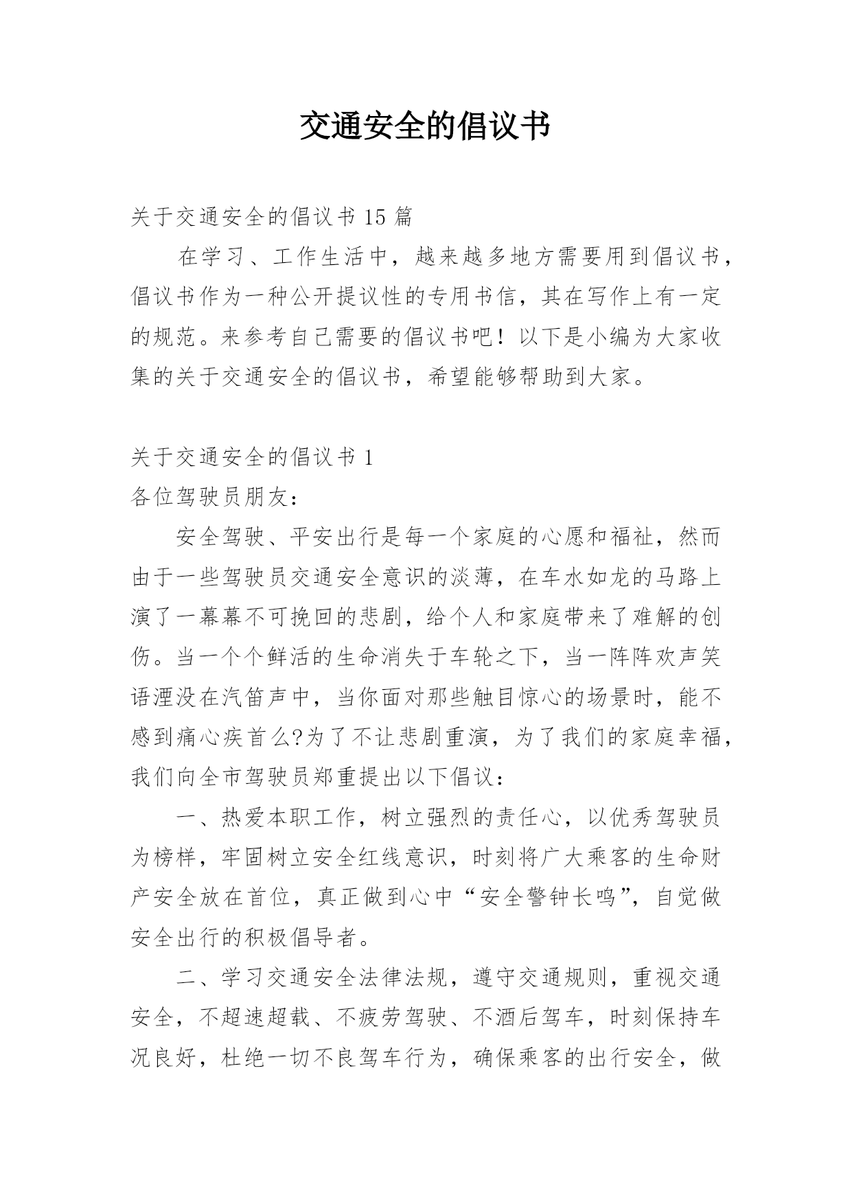 交通安全的倡议书关于交通安全的倡议书15篇在学习、工作生活中,越来越多地方需要用到倡议书,倡议书作为一种公开提议性的专用书信,其在写作上有一定的规范。来参考自己需要的倡议书吧!以下是小编为大家收集的关于交通安全的倡议书,希望能够帮助到大家。关于交通安全的倡议书1各位驾驶员朋友:安全驾驶、平安出行是每一个家庭的心愿和福祉,然而由于一些驾驶员交通安全意识的淡薄,在车水如龙的马路上演了一幕幕不可挽回的悲剧,给个人和家庭带来了难解的创伤。当一个个鲜活的生命消失于车轮之下,当一阵阵欢声笑语湮没在汽笛声中,当你面对那