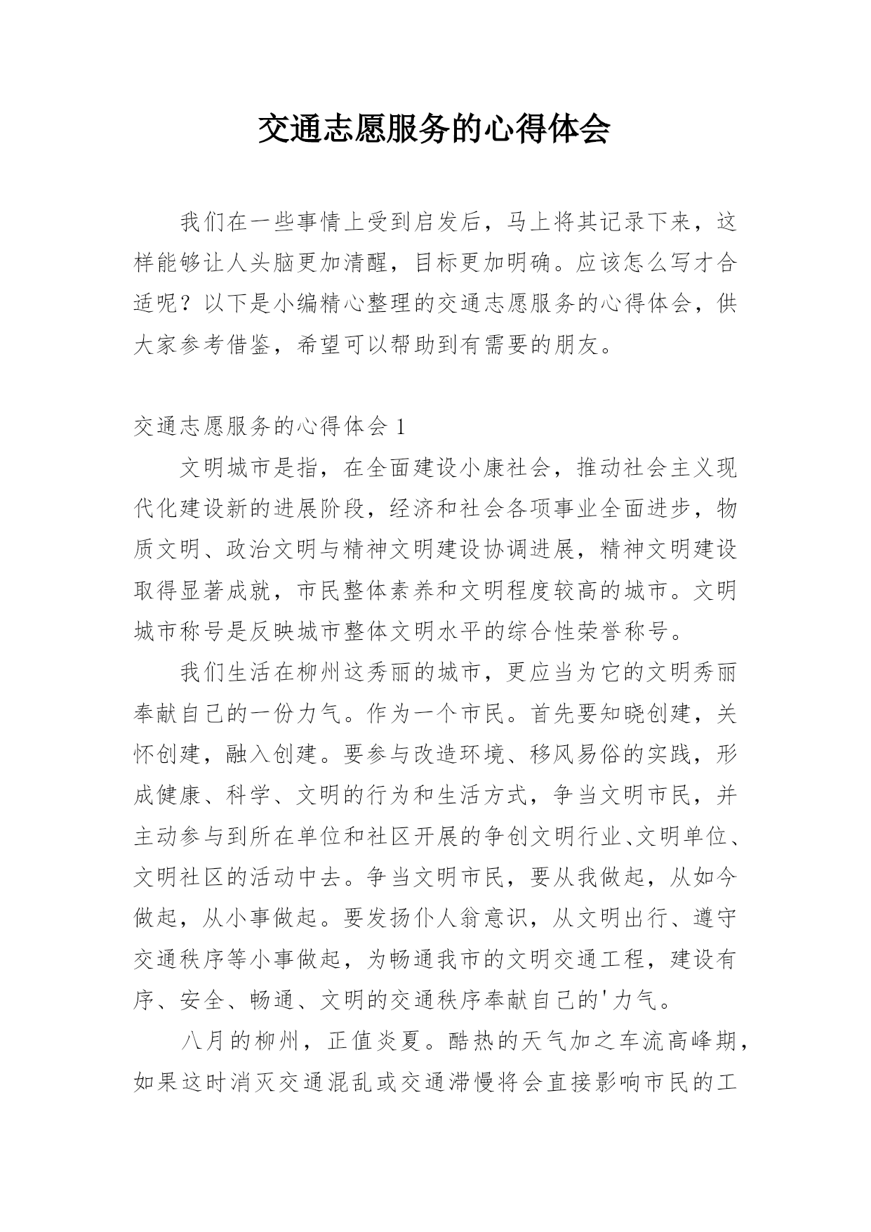 交通志愿服务的心得体会我们在一些事情上受到启发后,马上将其记录下来,这样能够让人头脑更加清醒,目标更加明确。应该怎么写才合适呢?以下是小编精心整理的交通志愿服务的心得体会,供大家参考借鉴,希望可以帮助到有需要的朋友。交通志愿服务的心得体会1文明城市是指,在全面建设小康社会,推动社会主义现代化建设新的进展阶段,经济和社会各项事业全面进步,物质文明、政治文明与精神文明建设协调进展,精神文明建设取得显著成就,市民整体素养和文明程度较高的城市。文明城市称号是反映城市整体文明水平的综合性荣誉称号。我们生活在柳州这秀
