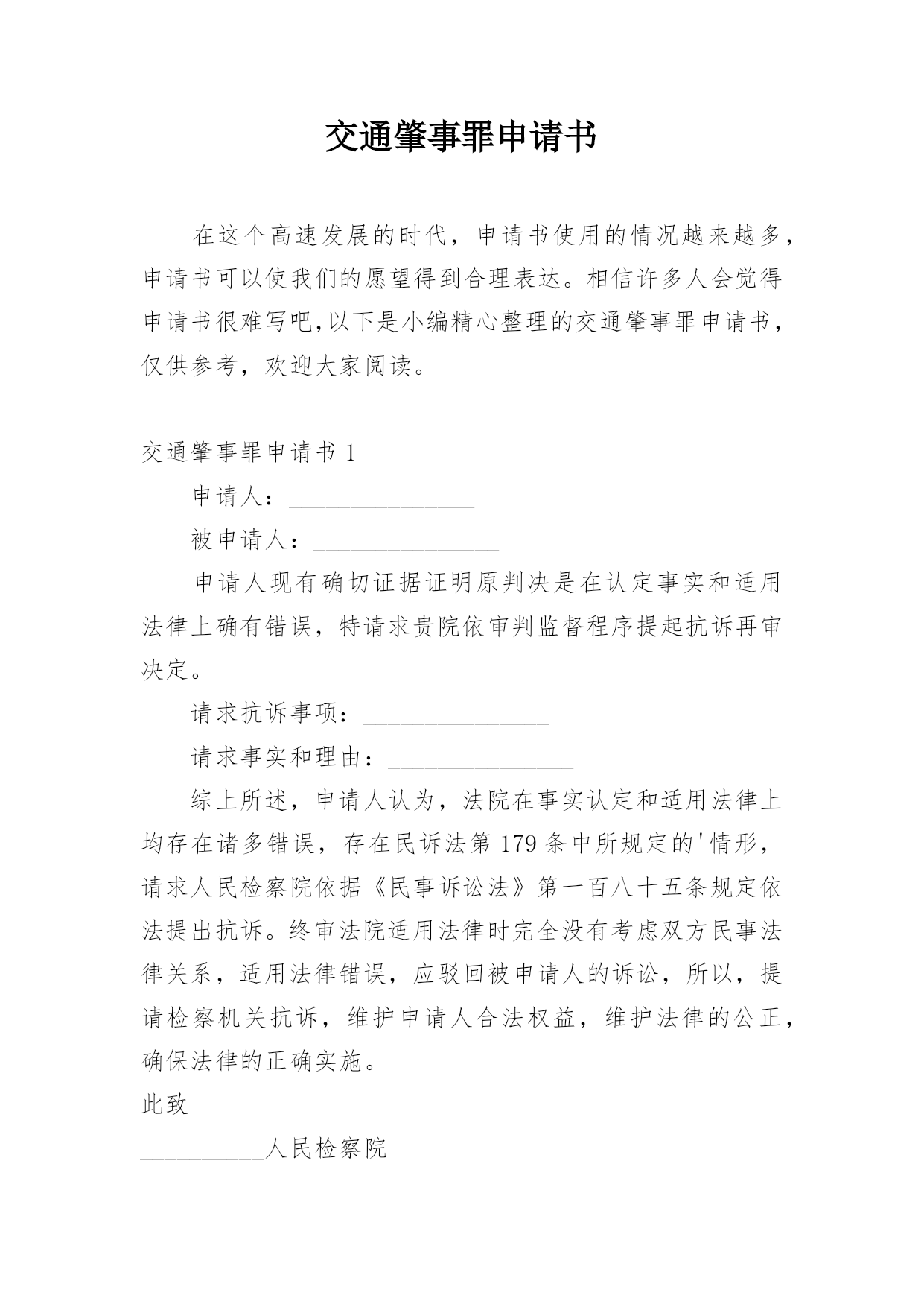 交通肇事罪申请书在这个高速发展的时代,申请书使用的情况越来越多,申请书可以使我们的愿望得到合理表达。相信许多人会觉得申请书很难写吧,以下是小编精心整理的交通肇事罪申请书,仅供参考,欢迎大家阅读。交通肇事罪申请书1申请人:_______________被申请人:_______________申请人现有确切证据证明原判决是在认定事实和适用法律上确有错误,特请求贵院依审判监督程序提起抗诉再审决定。请求抗诉事项:_______________请求事实和理由:_______________综上所述,申请人认为,法院